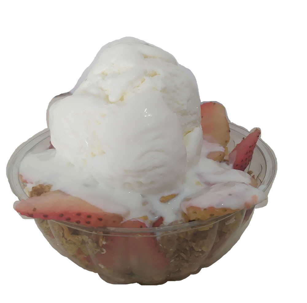 Cereal sin azúcar, granola, yogurt natural, fresas y un sabor de helado.
