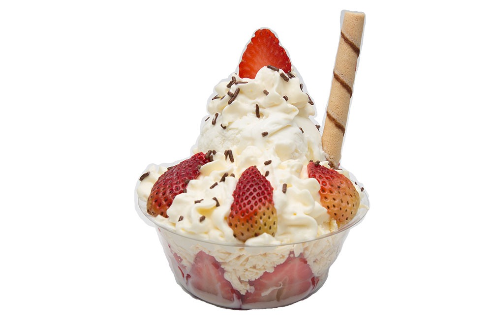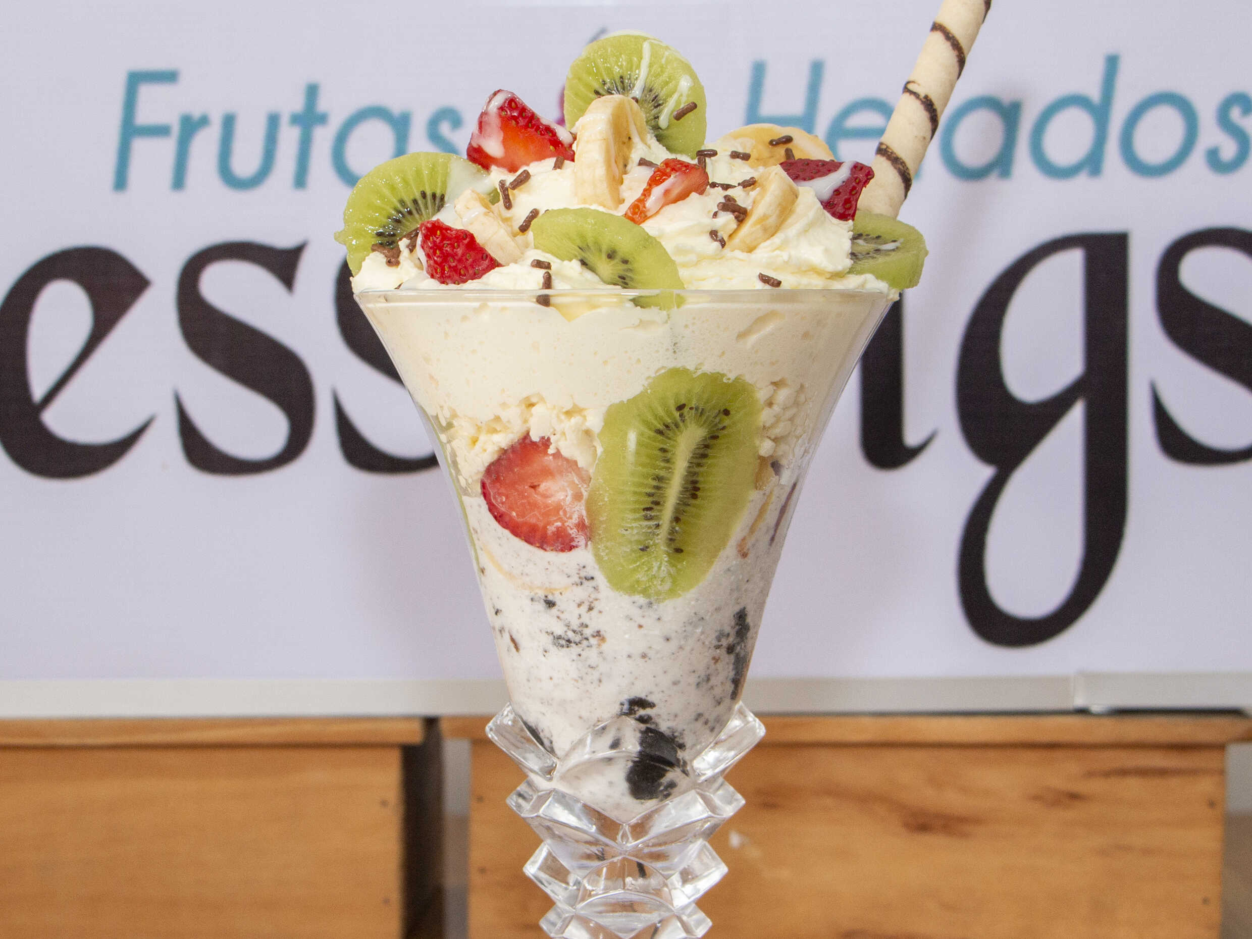 Dos sabores de helados, kiwi, banano, fresas, salsa, queso y chantill. tamaño de 20oz.