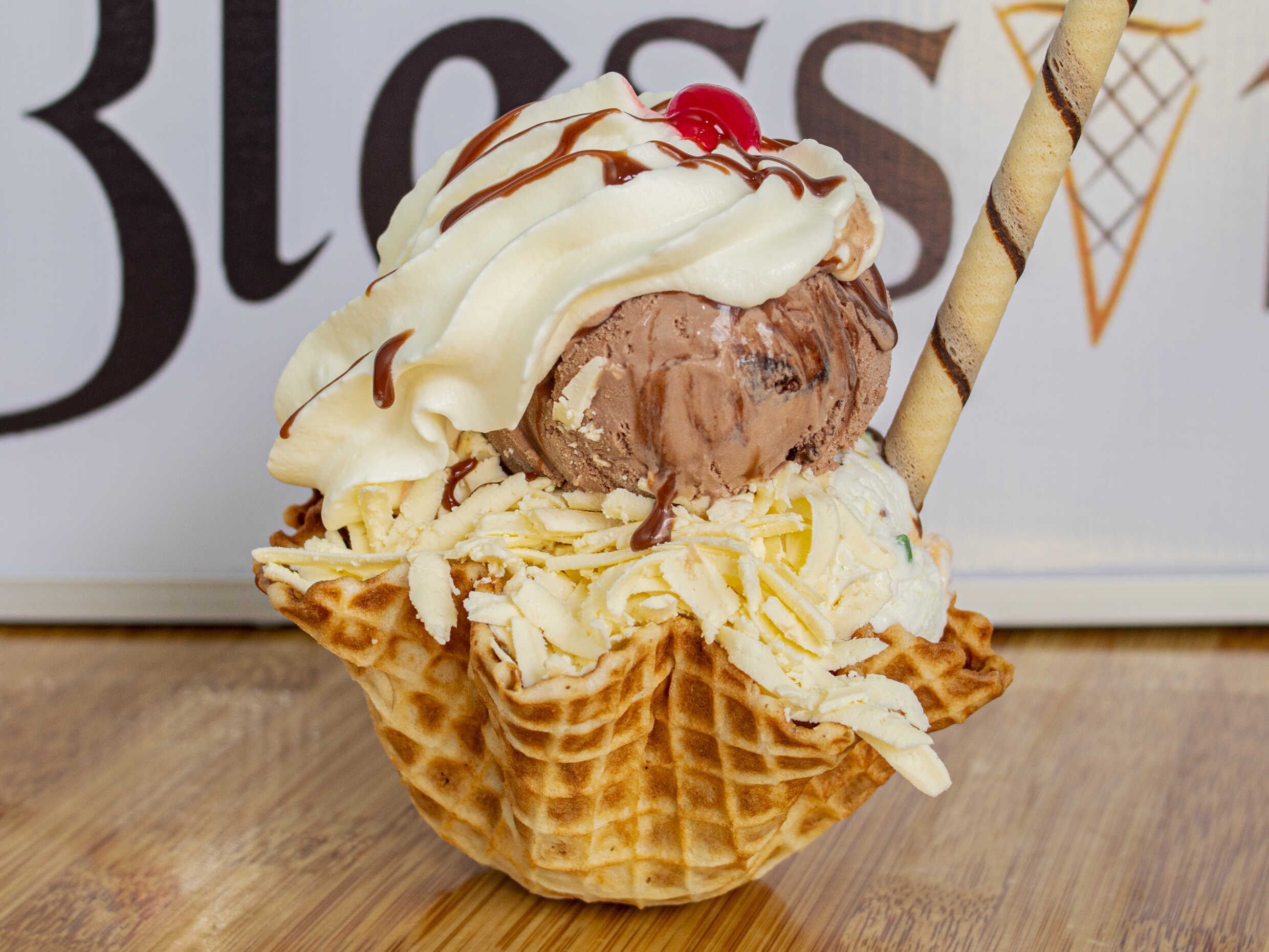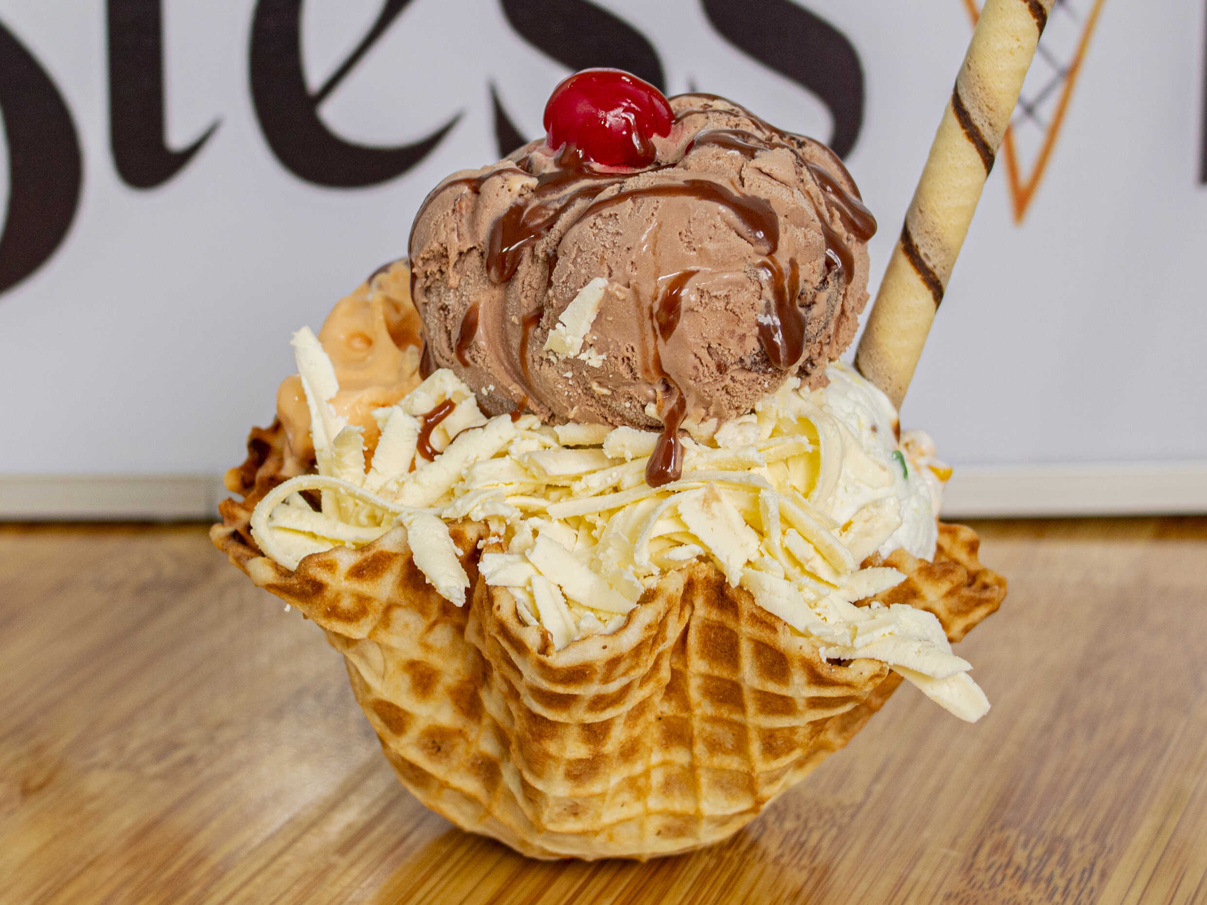 3 sabores de helados, 2 salsas, barquillo y cereza