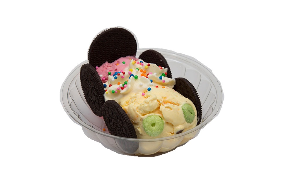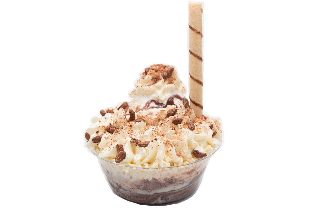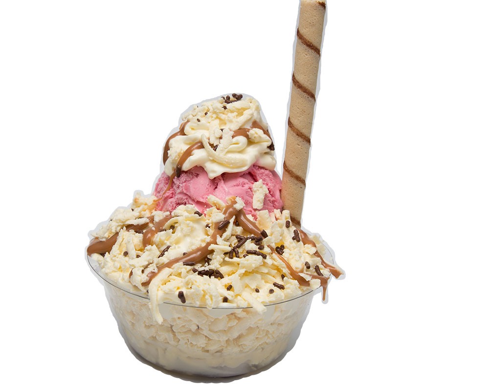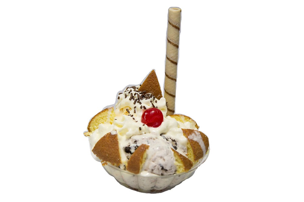 Porción personal de 18 onzas: dos sabores de helado, extra queso, barquillo, lluvia de chocolate, salsa y chantilly.