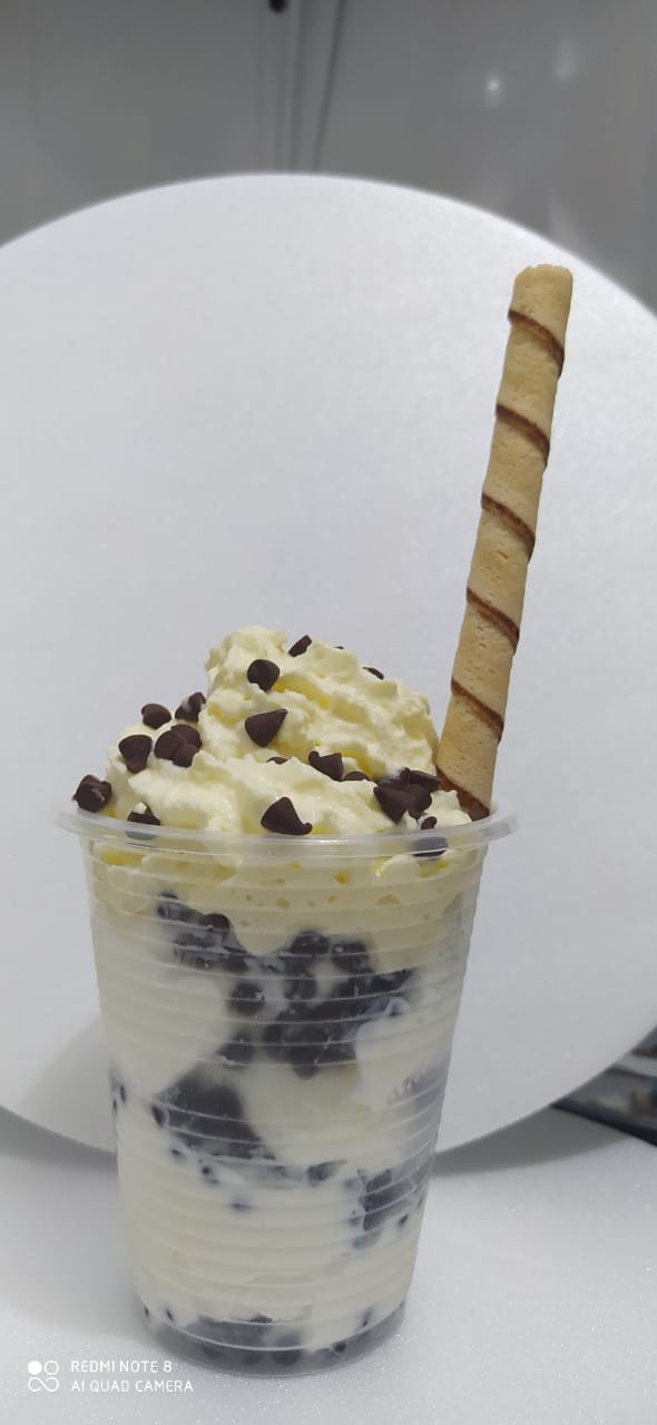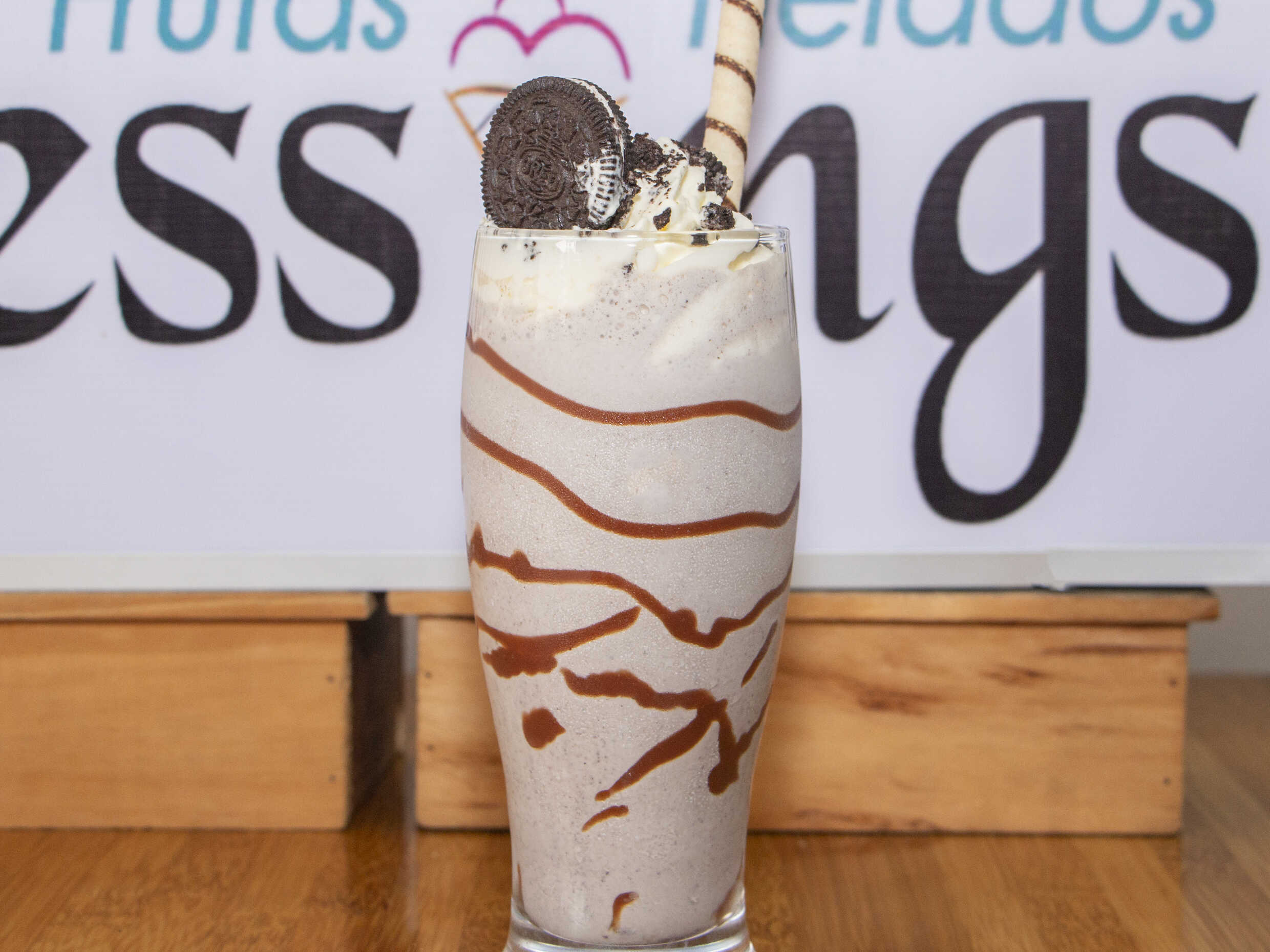 Malteada con helado de brownie, oreos, salsa de chocolate y Chantilly.