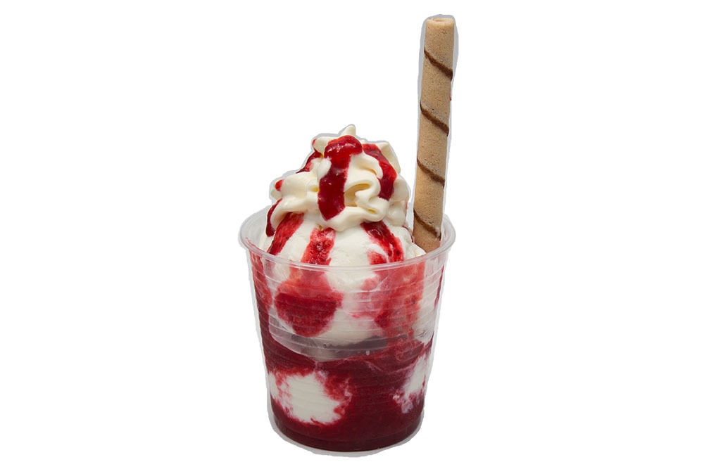 Un sabor de helado, salsa natural de frutos rojos, barquillo piazza y chantilly.