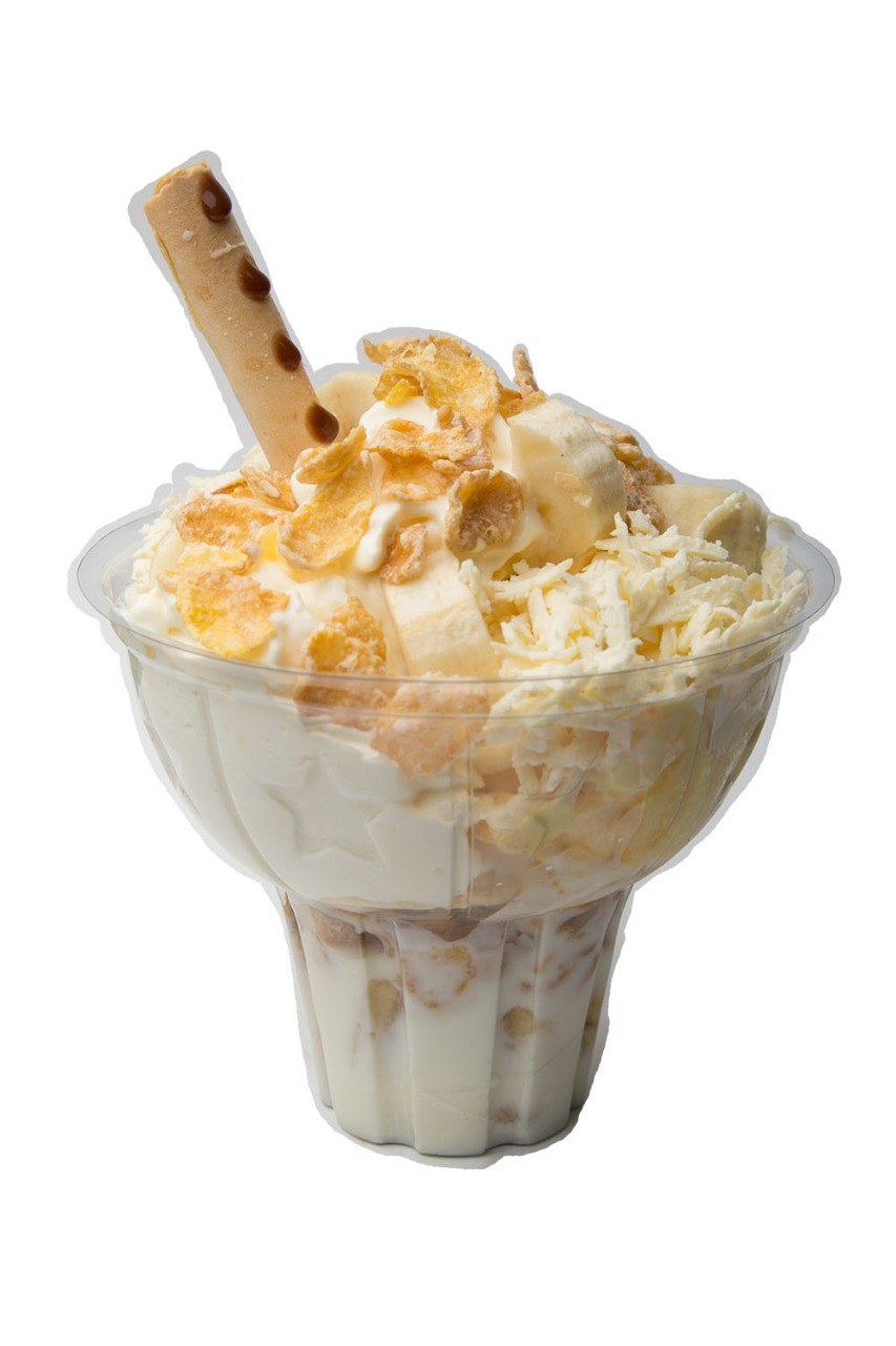 Dos sabores de helados, zucaritas, banano, queso, kumis, salsa, barquillo, cereza y chantilly.