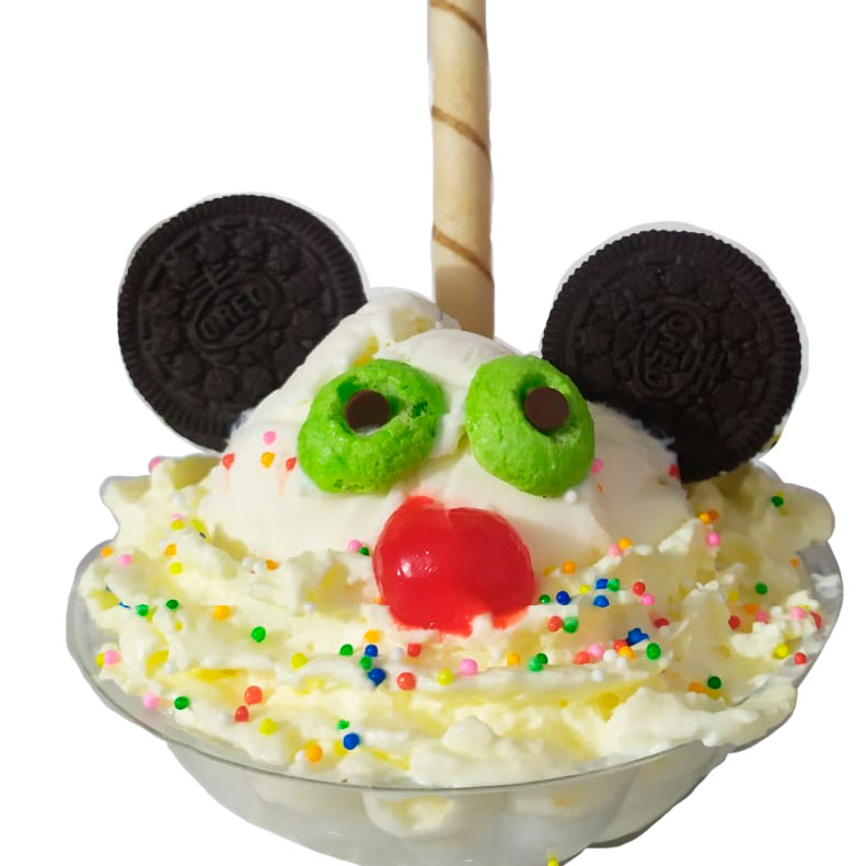 1 sabor de helado, salpicón, queso, zucaritas, milo, barquillo, salsa, cereza, chantilly.