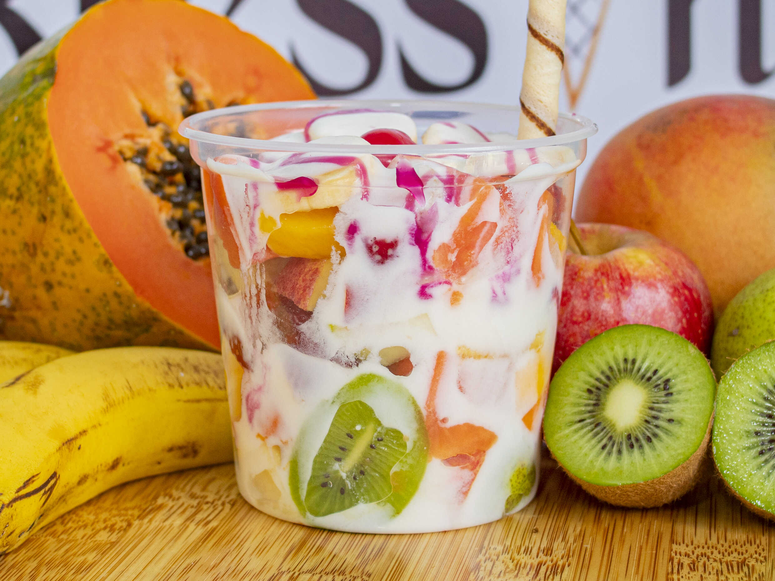 Trozos de frutas, kumis, barquillo y cereza tamaño de 24oz.