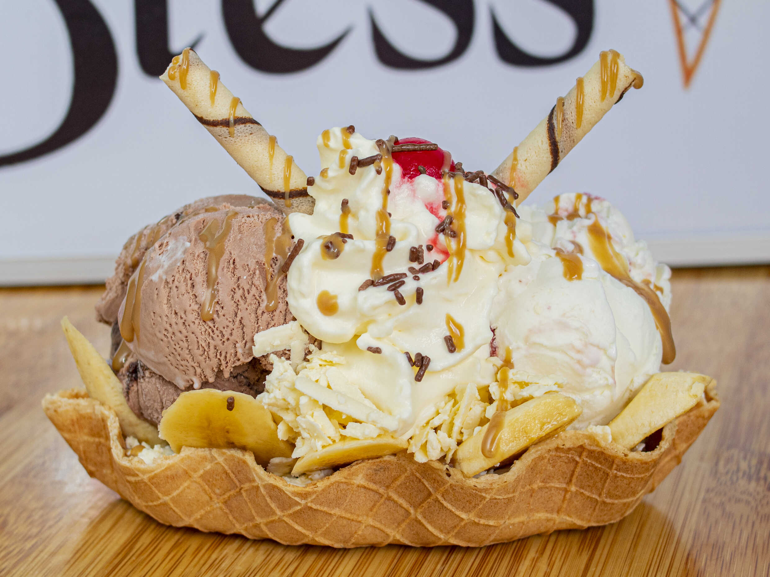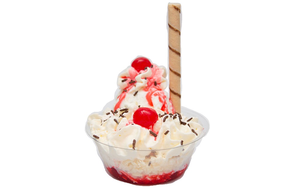 2 sabores de helados, queso, chantilly, 2 salsas, barquillo y cereza.