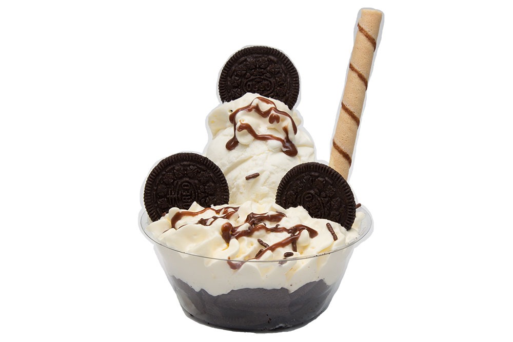 Dos sabores de helados, queso, lluvia de chocolate, barquillo, galletas oreo y chantilly.