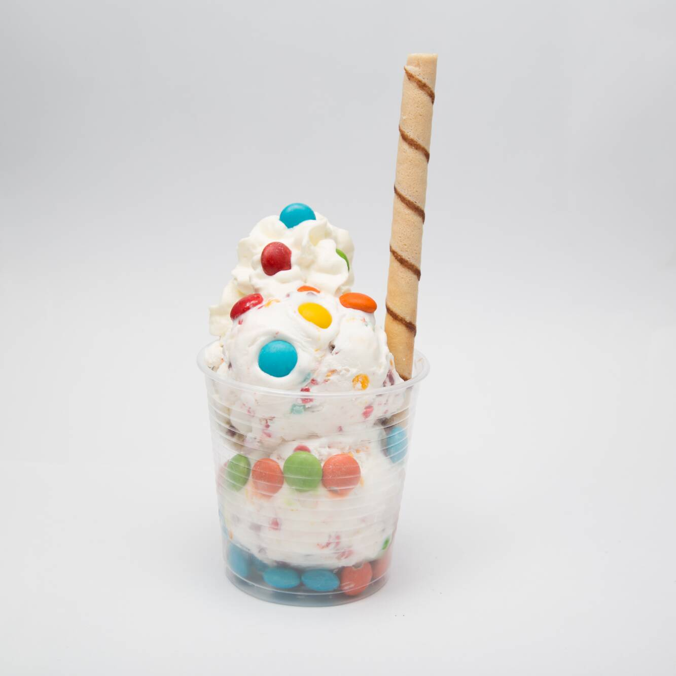 Un sabor de helado, m&m, salsa, barquillo piazza y chantilly.