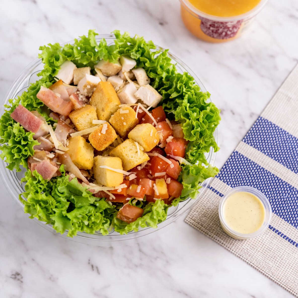 Pollo a la plancha con queso parmesano, tocineta, crotones de pan, tomate, sobre una cama de lechuga acompañado de aderezo cesar