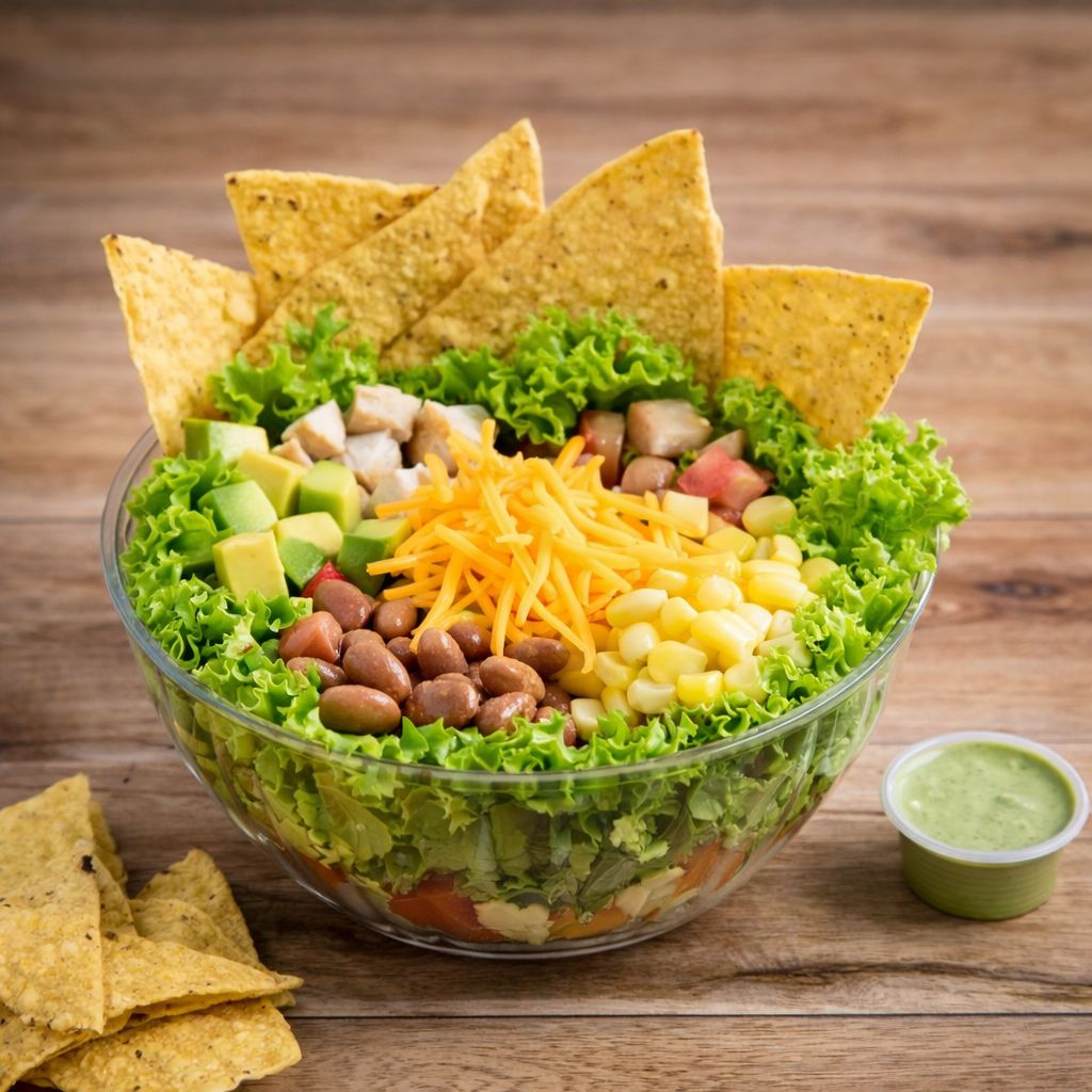 Pollo a la plancha con queso cheddar, aguacate, frijoles, tomate, maíz tierno, nachos sobre lechuga crespa y crema agria