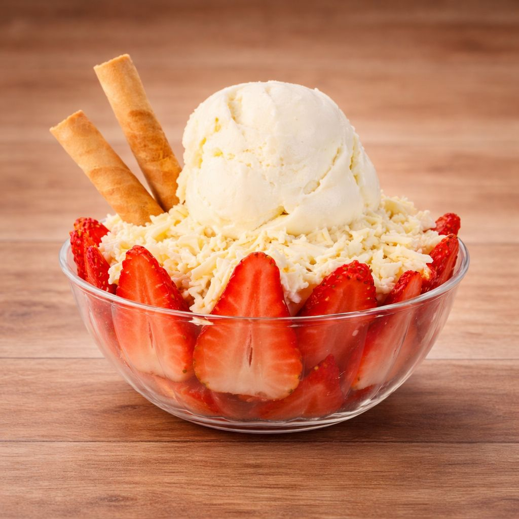 Fresas con helado de vainilla, queso colanta, crema de leche y lecherita.