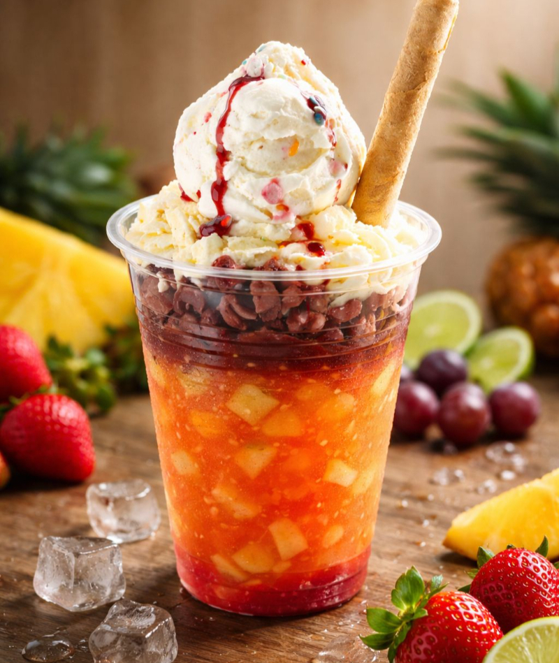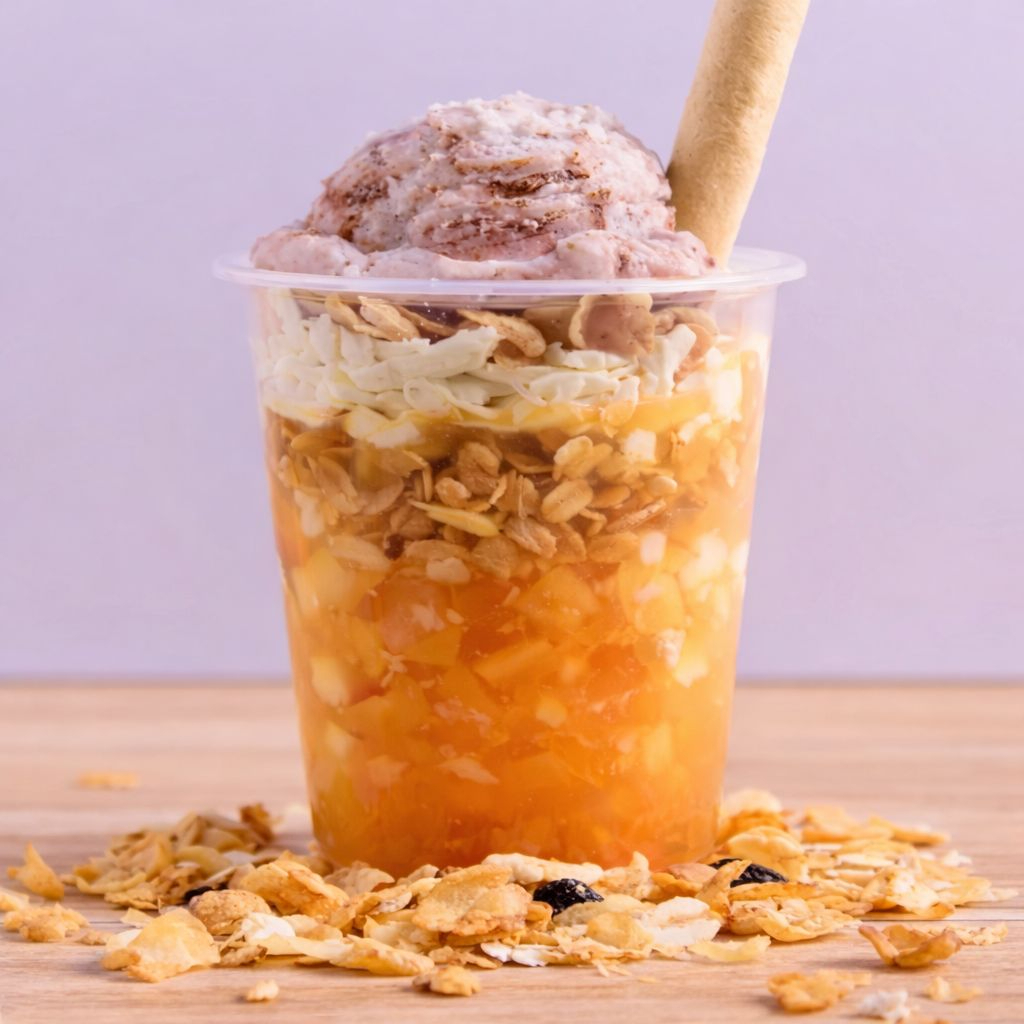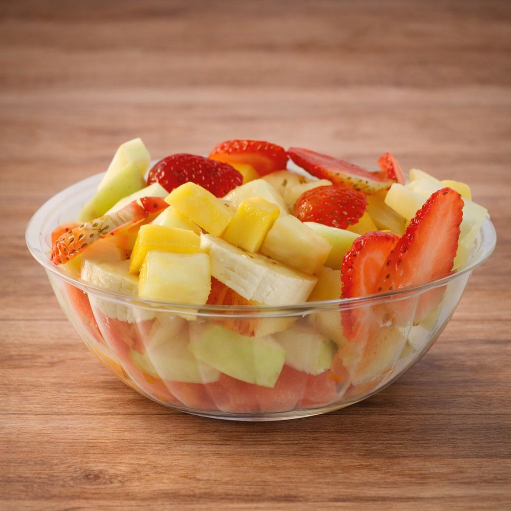 Ensalada de frutas acompañada de Helado de Vainilla, cereal (zucaritas, granola, hojuela sin azúcar o crispí), queso colanta, helado, barquillo, crema de leche, lecherita, yogurt, fresa, manzana verde, manzana gala, pera, mango, piña, banano, uva, melón y papaya