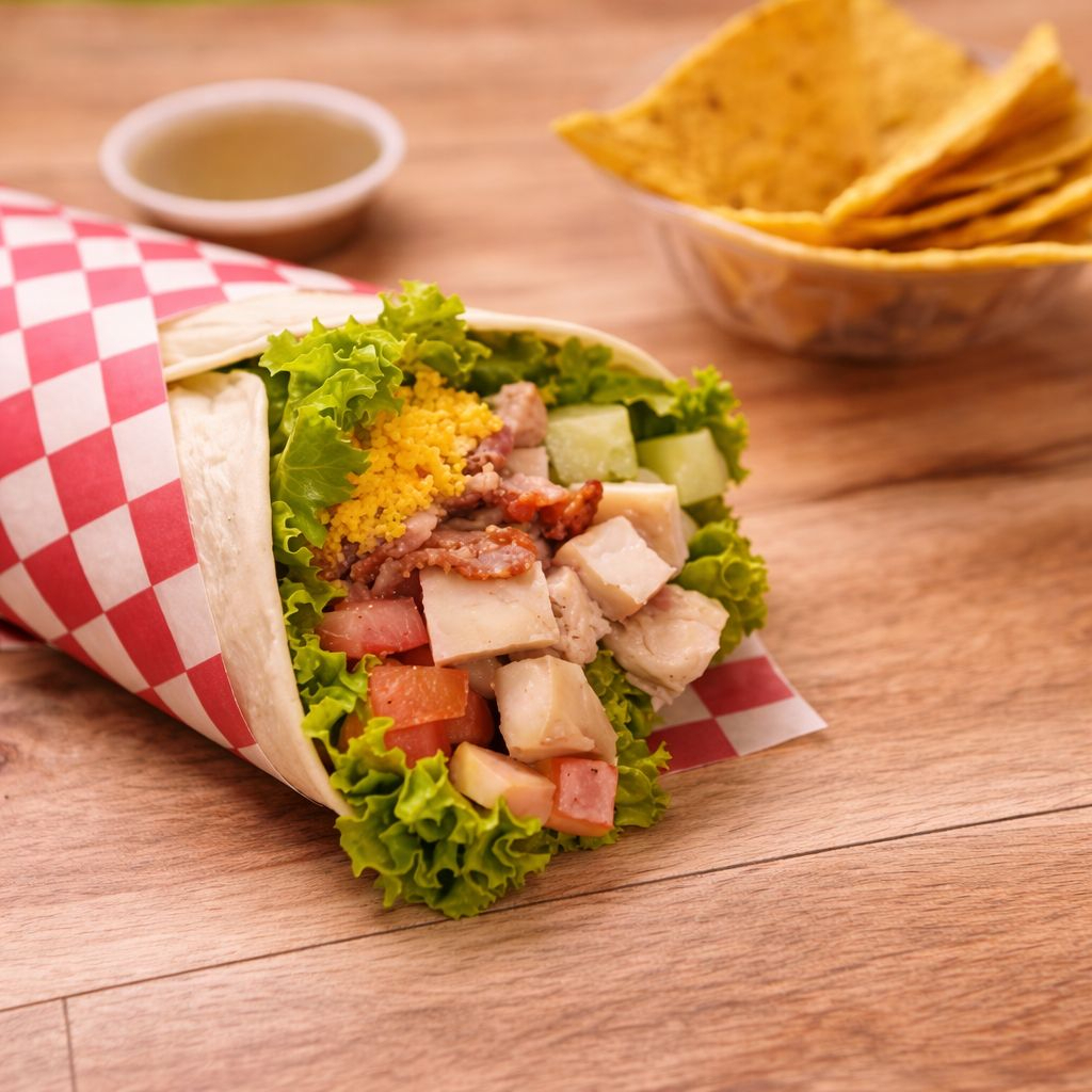Wrap en tortilla de harina, pollo en cubos, lechuga, tomate, pepino, queso cheddar, tocineta y aderezo miel balsámico. Acompañado de Nachos.