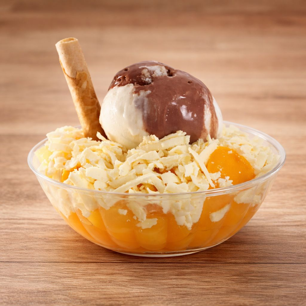 Duraznos con helado de vainilla, queso colanta, crema de leche y lecherita.