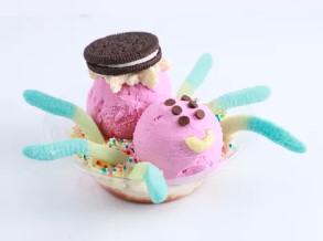 2 Sabores de helado a elegir, acompañados de chantilly, lecherita, grageas de colores y gomitas gusanitos.