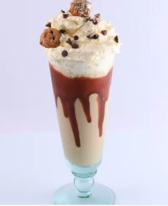 Malteada con sabor de helado a elegir, acompañada de crema de whisky Baileys, galleta de hojaldre, chantilly, barquillo piazza, lluvia de chocolate y salsa de arequipe.