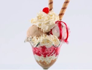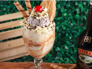 Copa con 2 sabores de helado a elegir, acompañados de Baileys, galleta hojaldre, cereza, chips de chocolate, chantilly, salsa y barquillo piazza.