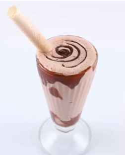 Malteada con sabor de helado a elegir, acompañada de salsa, chips de chocolate y barquillo piazza.