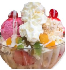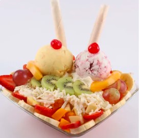 Copa con 2 sabores de helado a elegir (12 Onzas) , acompañados de mango, fresas, kiwi, cereza, chantilly, salsa de la de mora y barquillo.