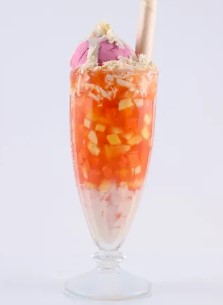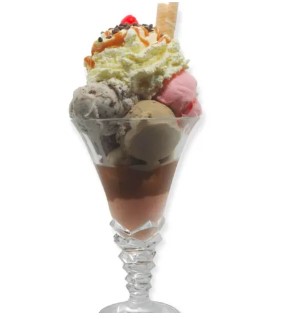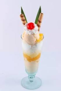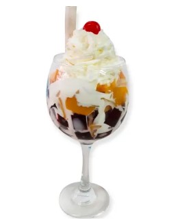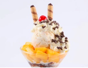 Copa con 2 sabores de helado a elegir, acompañados de durazno, mango, piña en almíbar, chantilly, salsa de la casa y barquillo piazza.
