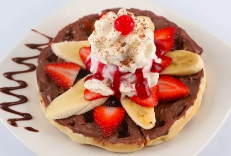 Waffle acompañado de un sabor de helado a elegir, cobertura de chocolate, chantilly, banano, fresas y cereza.