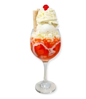Copa con 2 sabores de helado a elegir, acompañados de gelatina, Fresas, cereza, chantilly, crema de leche, barquillo y salsa de la casa.