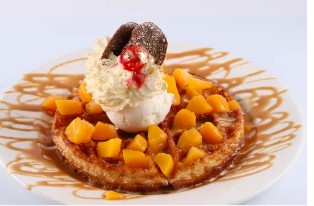 Waffle acompañado de un sabor de helado a elegir, chantilly, galleta Oreo, durazno, kiwi, fresas, salsas de la casa y cereza.