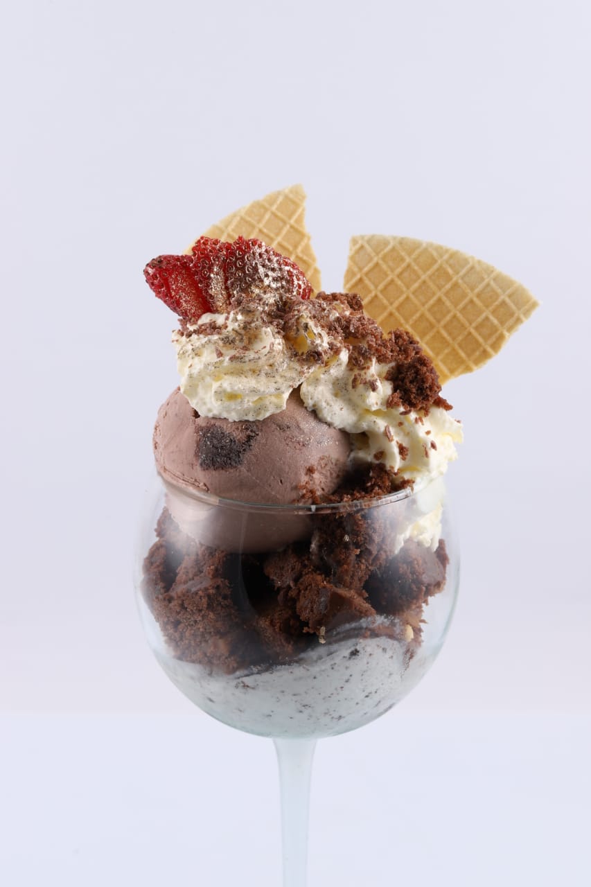 Deliciosa combinación de trosos de brownie con tres sabores de helado a tu gusto chantilly y barquillo