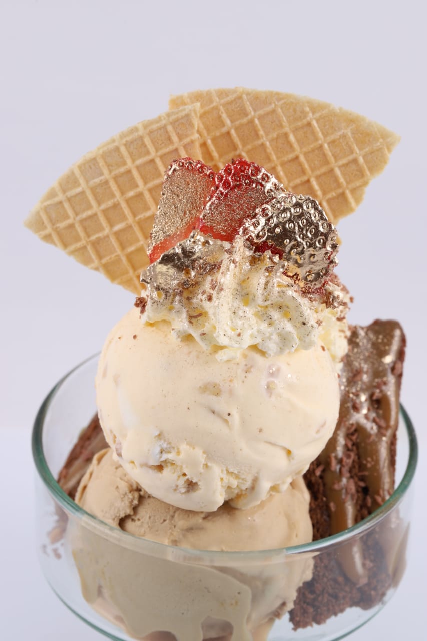 Delicioso combinación de crispy blanco y crispy negro bañado con crema de leche y acompañado de dos sabores de helado a tu gusto con chatilly y barquillo.