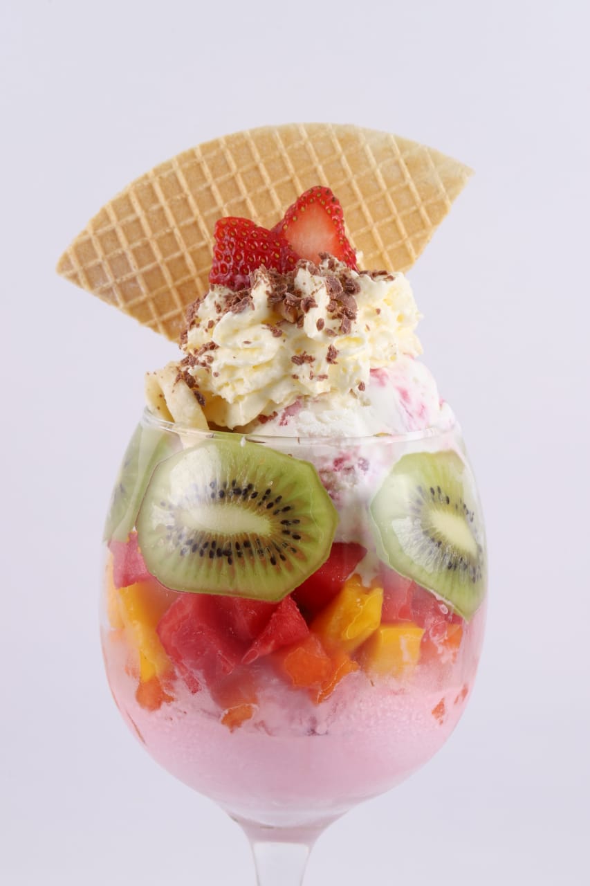 Deliciosa combinación de la fruta, dos sabores de helado ,chantilly y barquillo