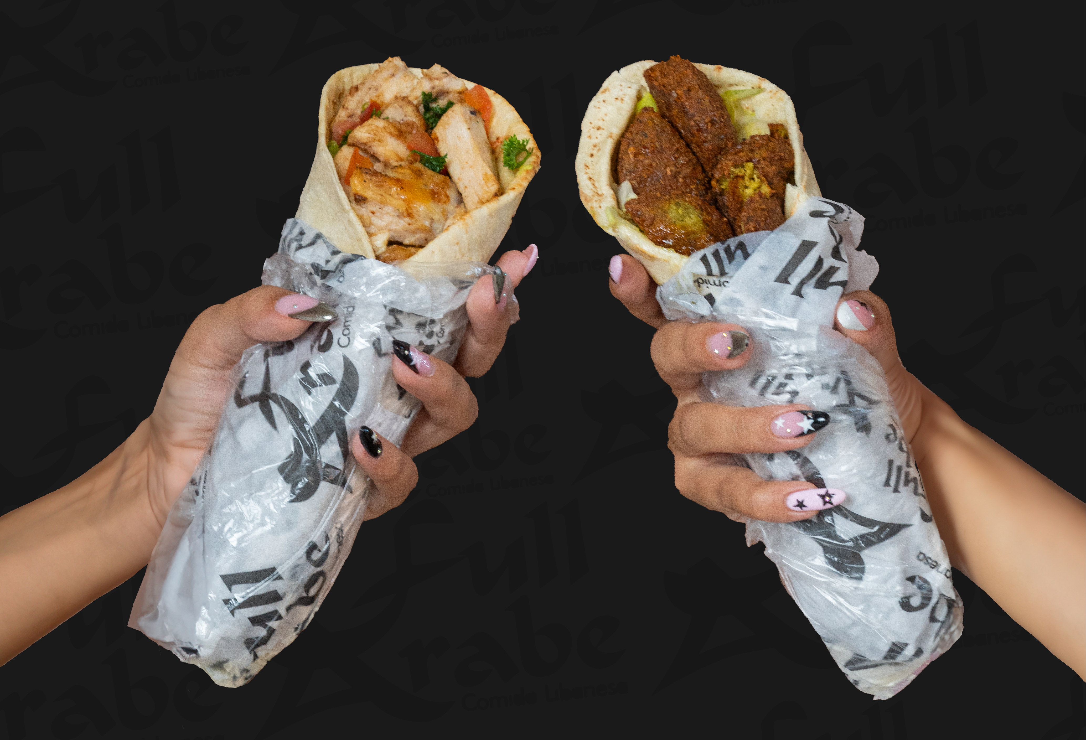Proteína: pollo, falafel o mixto, ensalada de lechuga, tomate, perejil, cebolla o ensalada de tabule, crema de garbanzo y salsas.