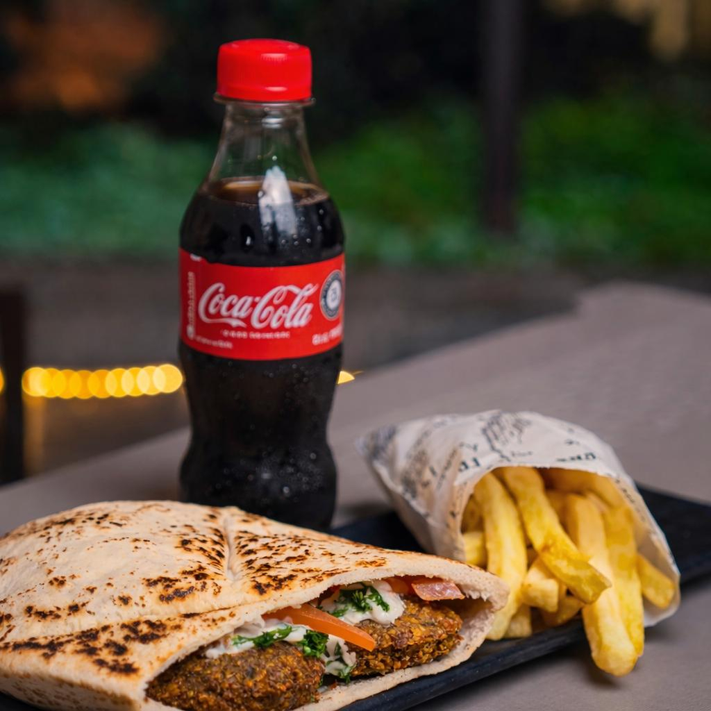 Pan Pita relleno con carne de cerdo, ensalada de repollo , encurtido , hummus , salsas de la casa , papas a la francesa y gaseosa pet 250ml