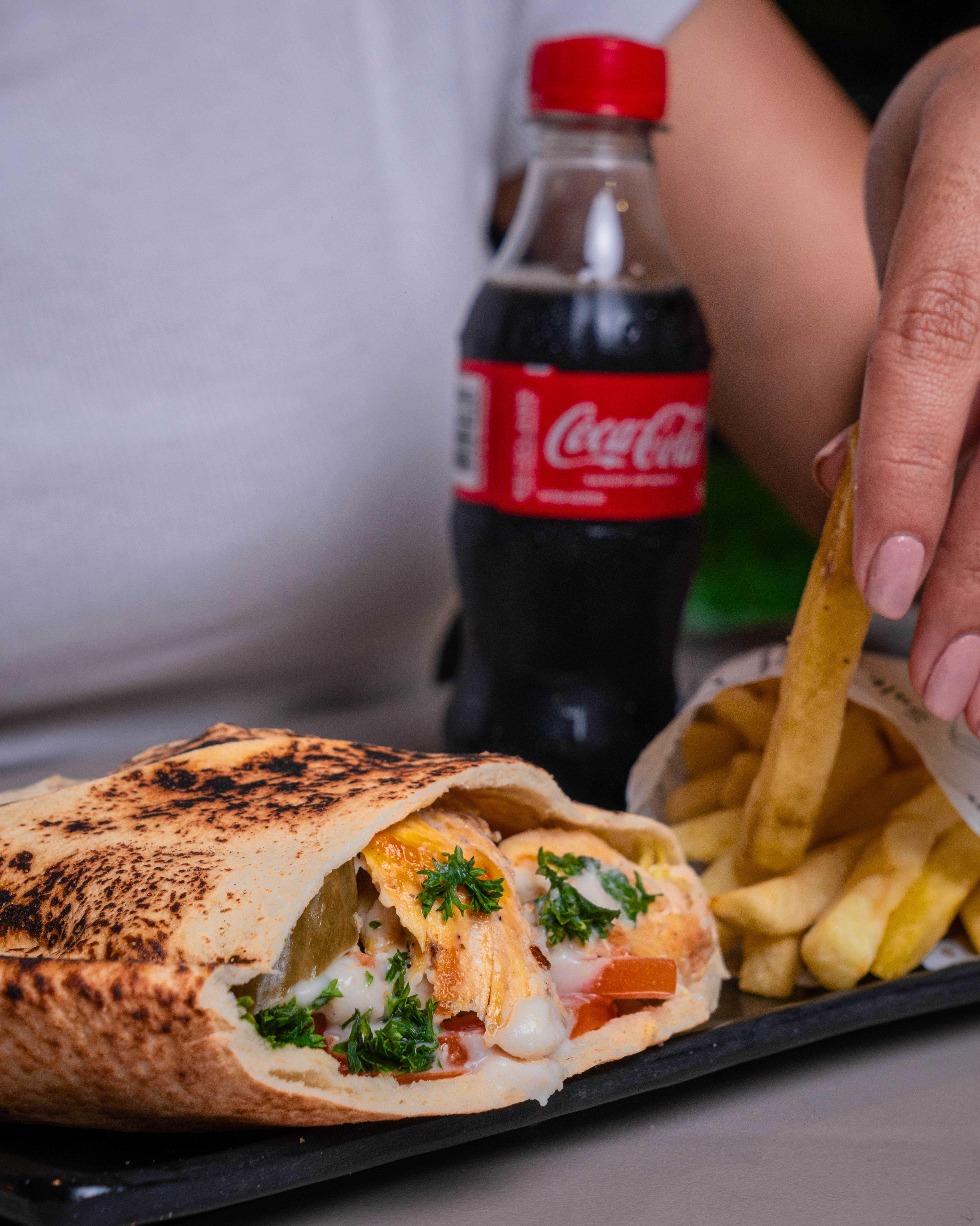 Porción individual Pan Pita relleno de pollo , ensalada de repollo , encurtido , hummus , salsas de la casa , papas a la francesa y gaseosa pet 250ml