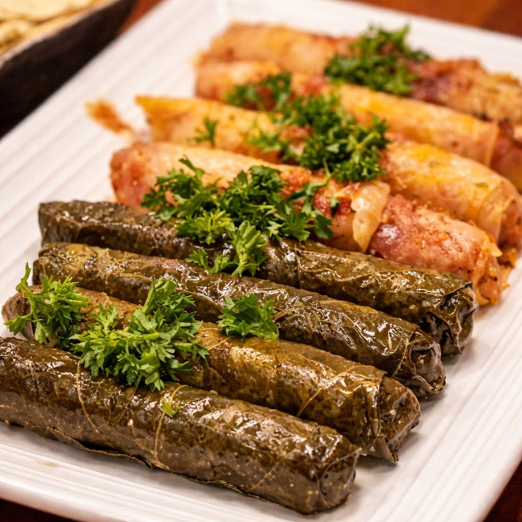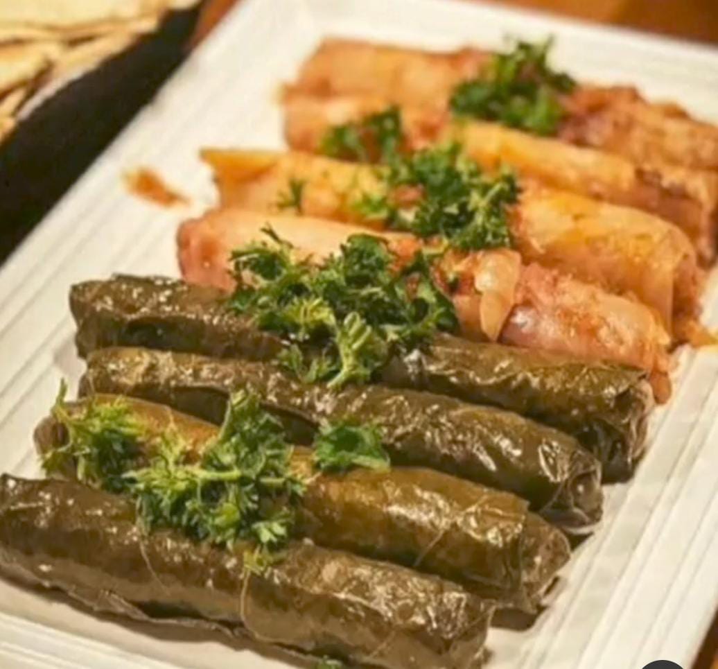 7 Unidades de tabaquitos de hojas de repollo, rellenos de carne molida y arroz, acompañados de pan árabe.