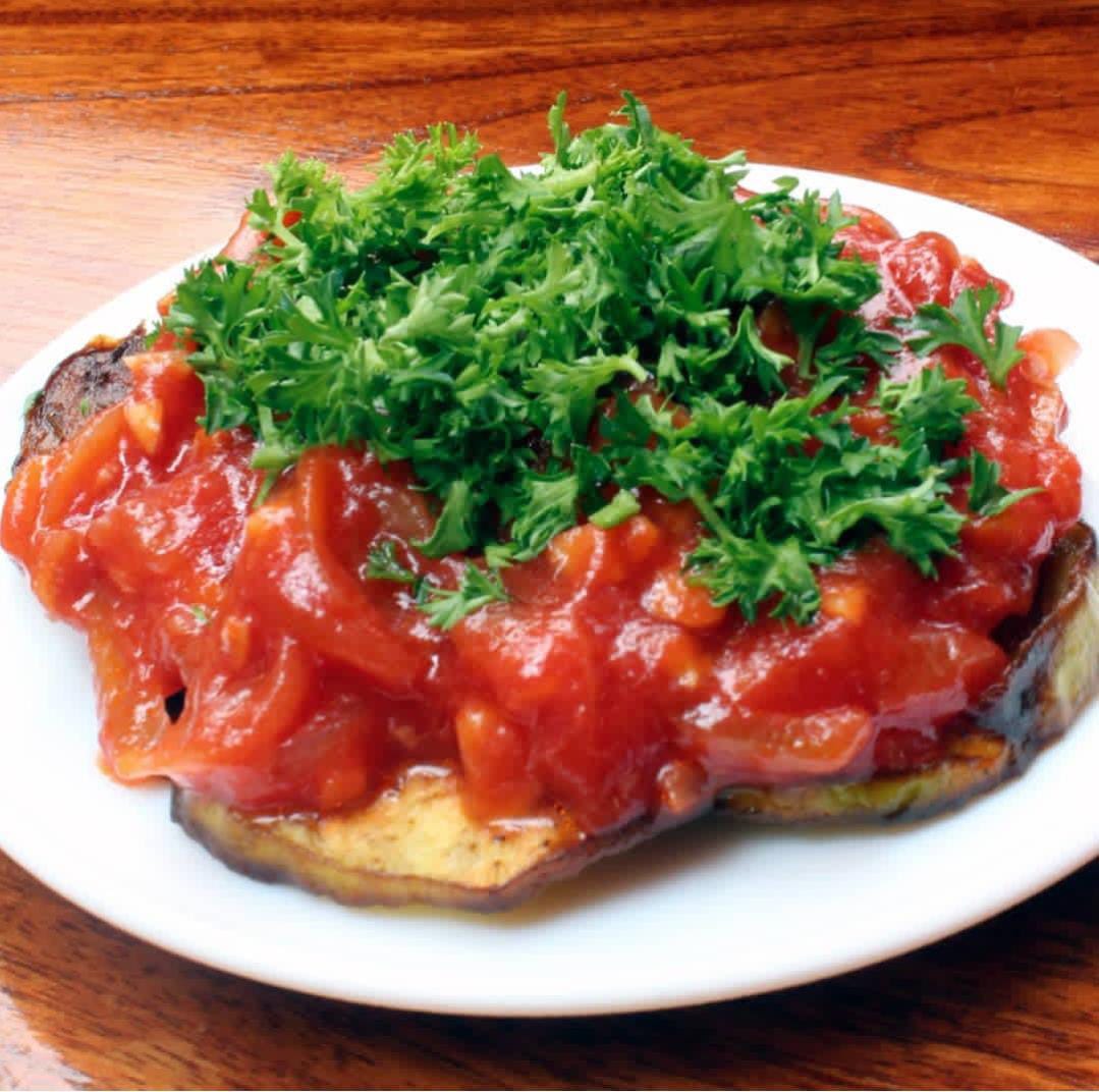 Berenjenas en salsa de hogao, acompañadas de pan árabe.