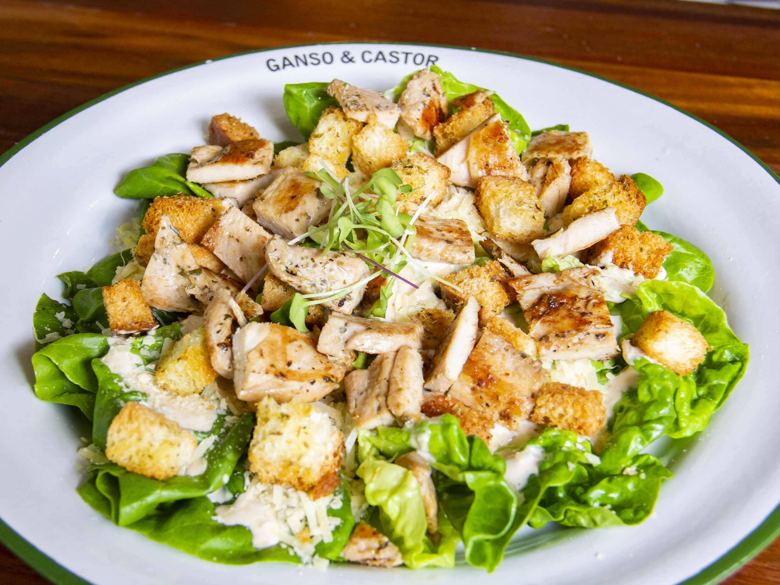 Ensalada cesar con pollo, lechuga, croutones, tomates perla y vinagreta cesar.