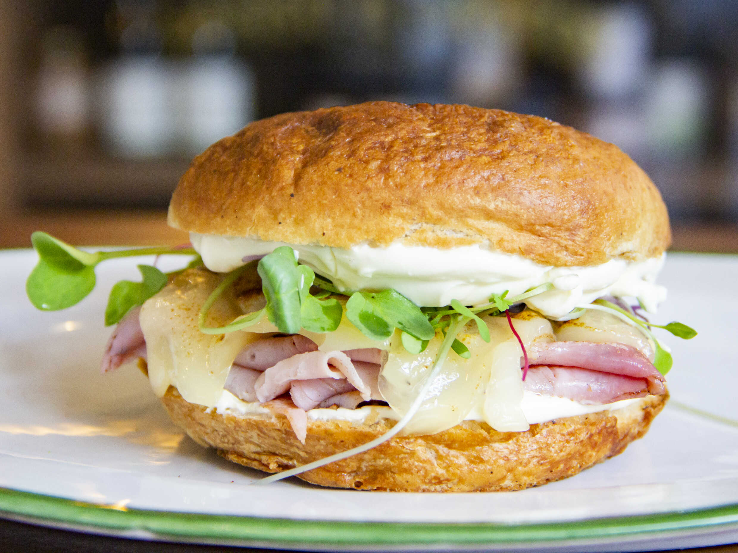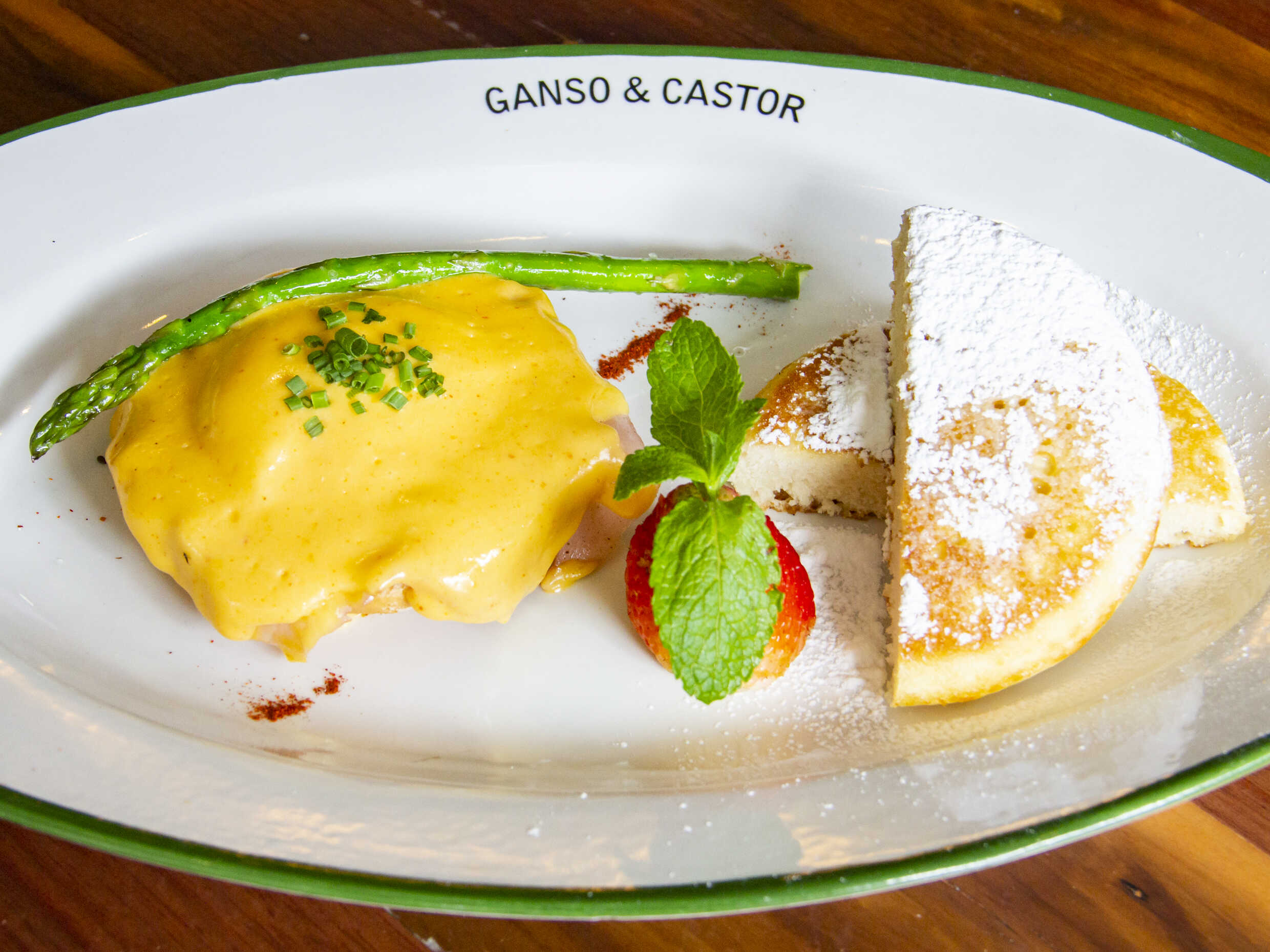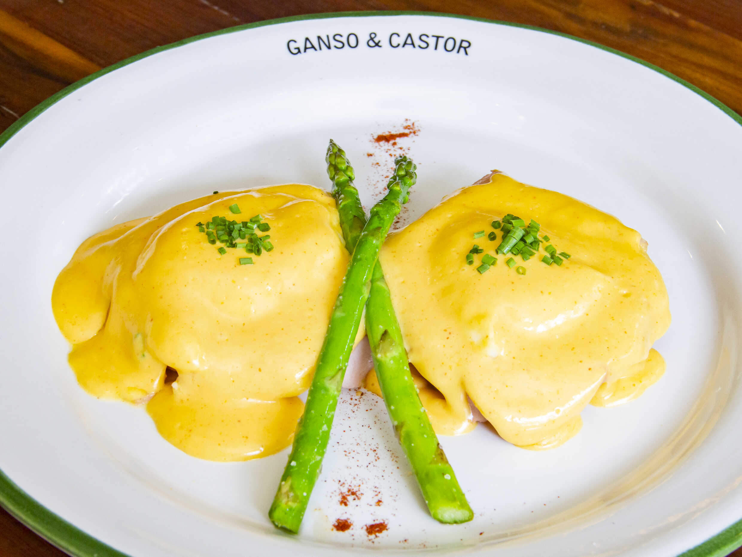 Huevos pochados sobre muffin inglés con jamón koller, salsa holandesa y espárragos.