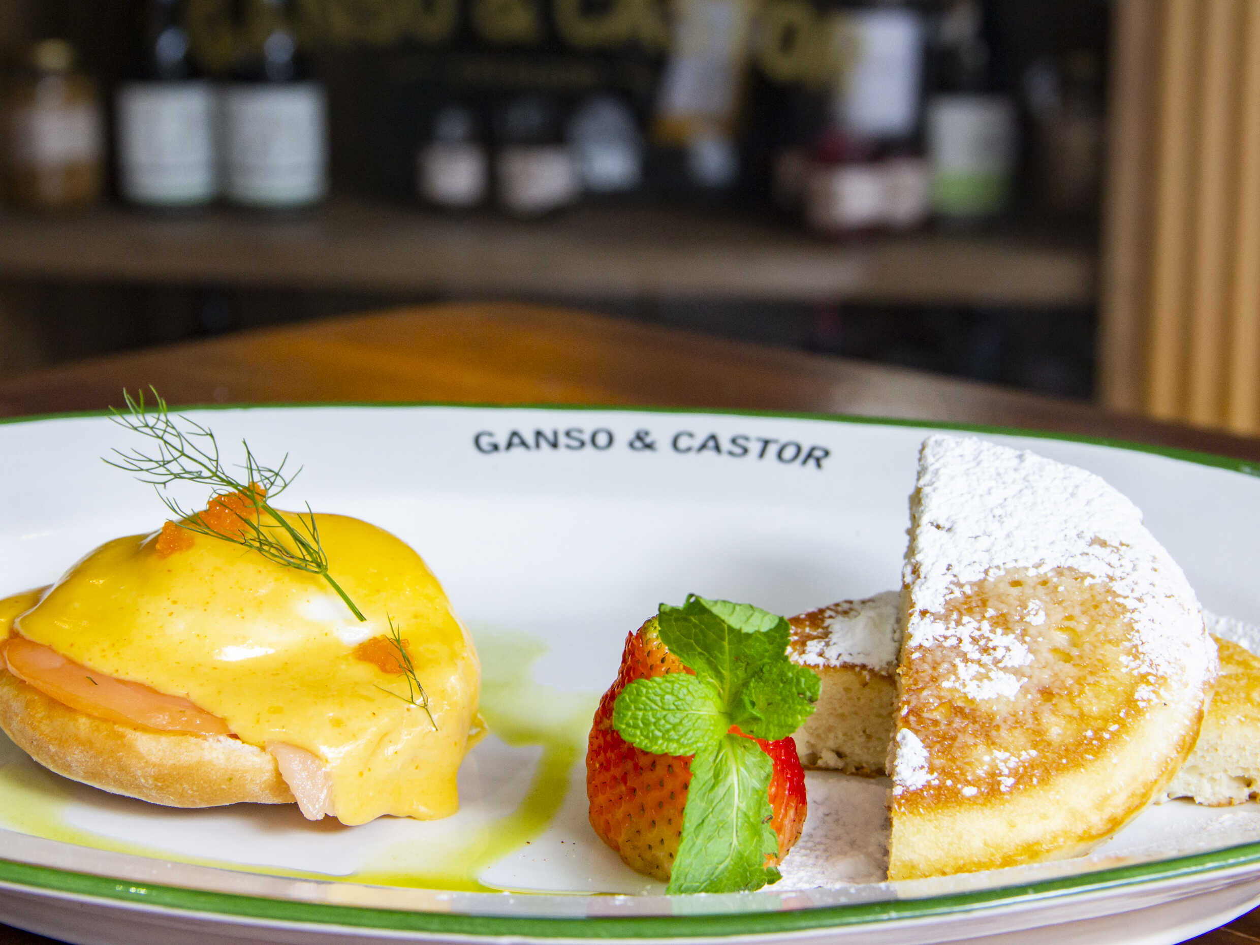 Huevo pochado sobre muffin y masago, con acompañamiento a elección.