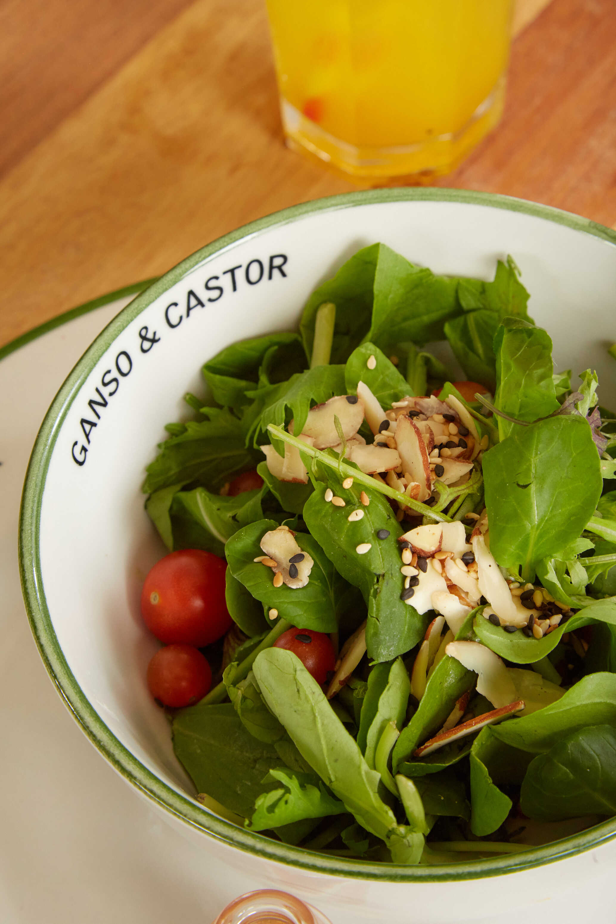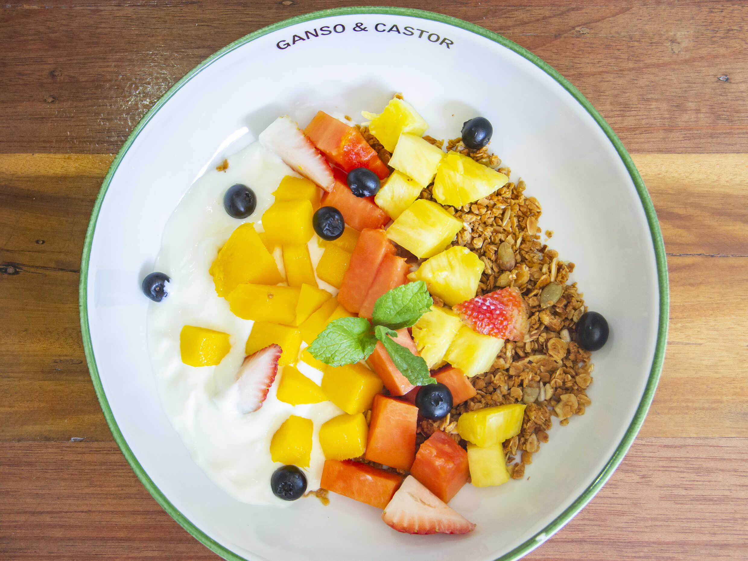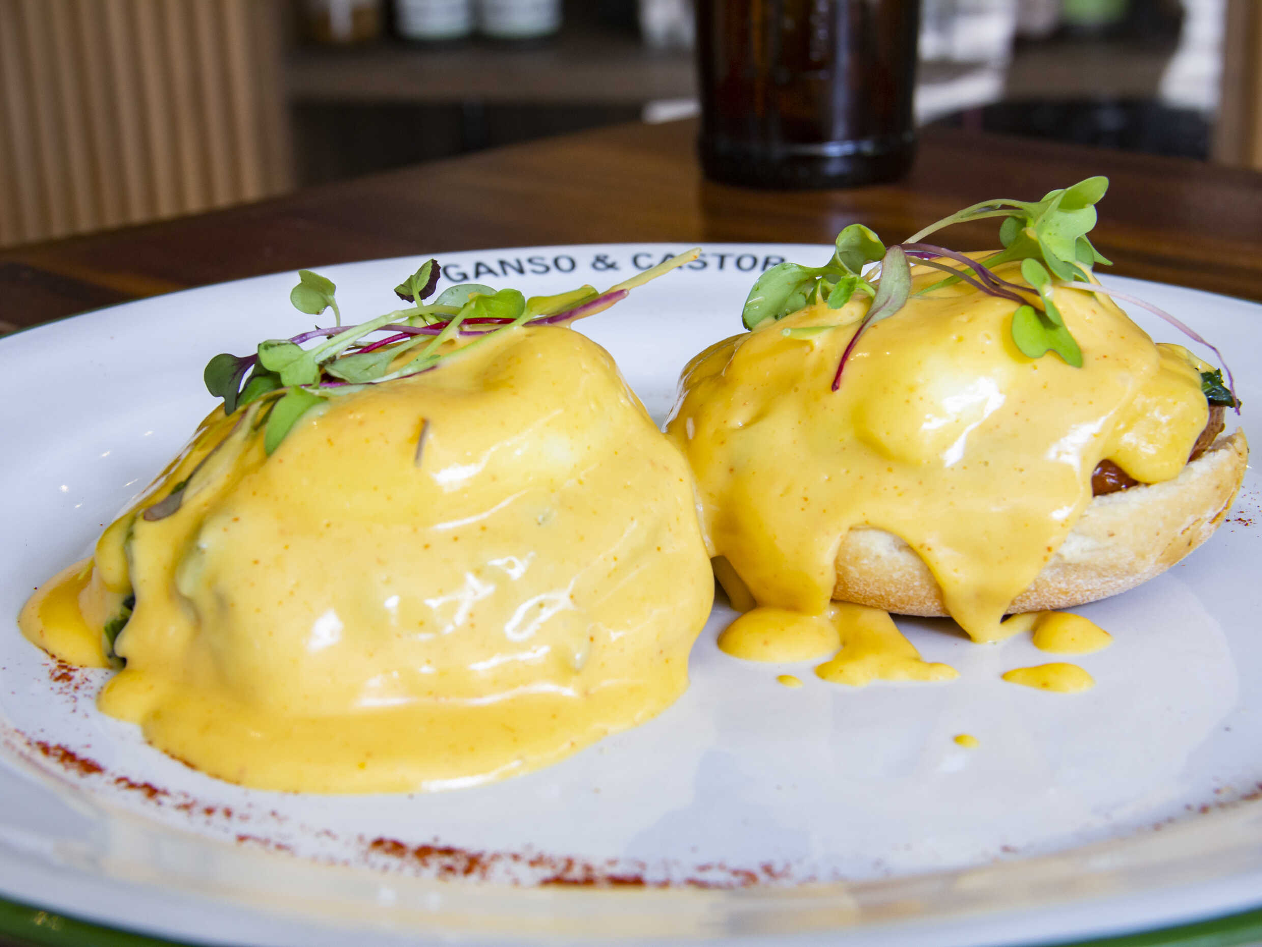 Huevos Florentinos. Huevos pochados sobre muffi inglés, con espinaca, tomates asados y salsa holandesa.