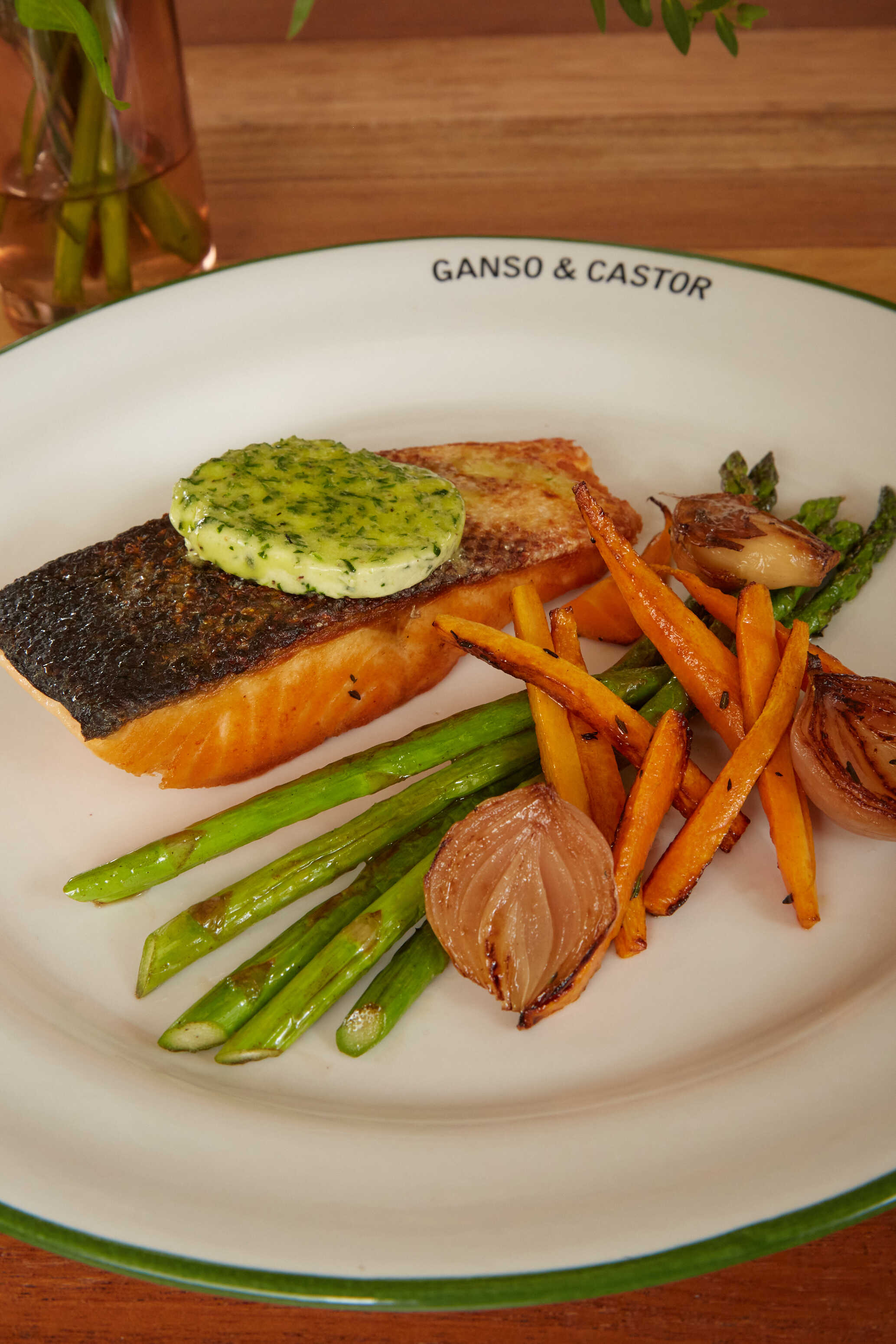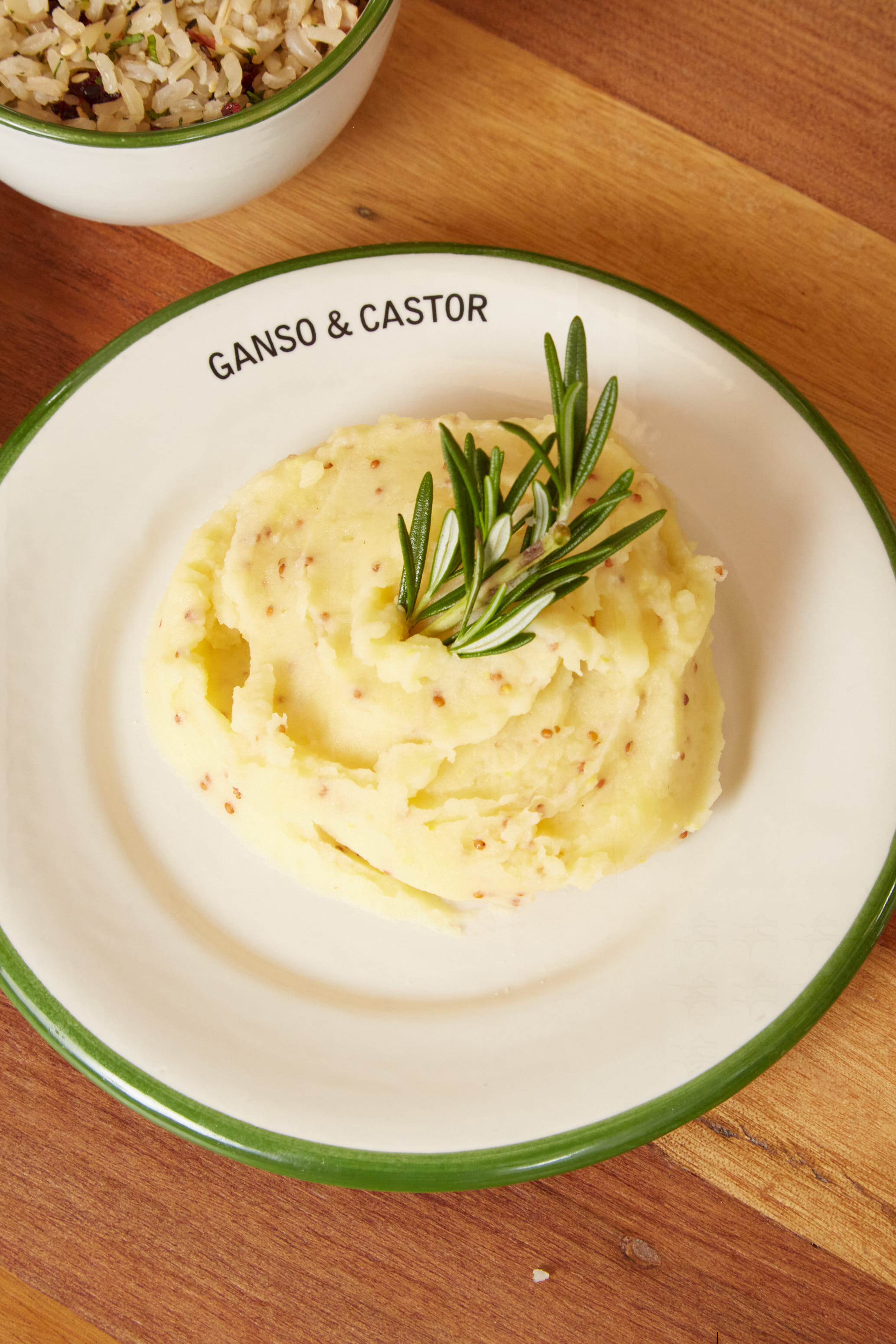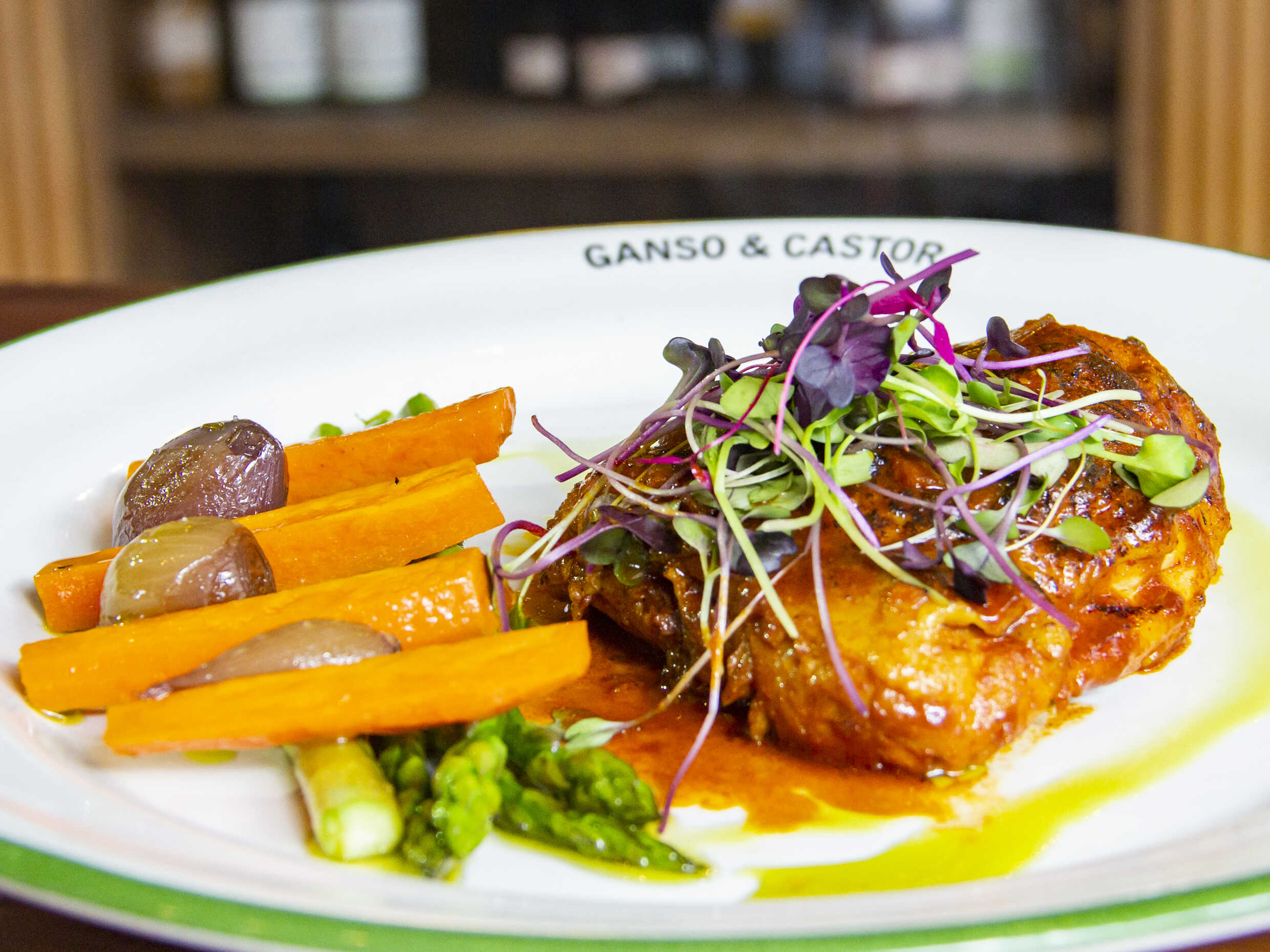 Estofado de res acompañado de pure cremoso, tomate perla y esparrago.