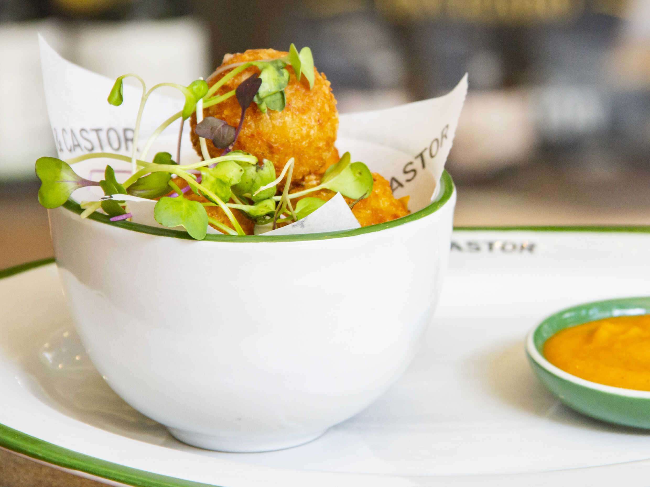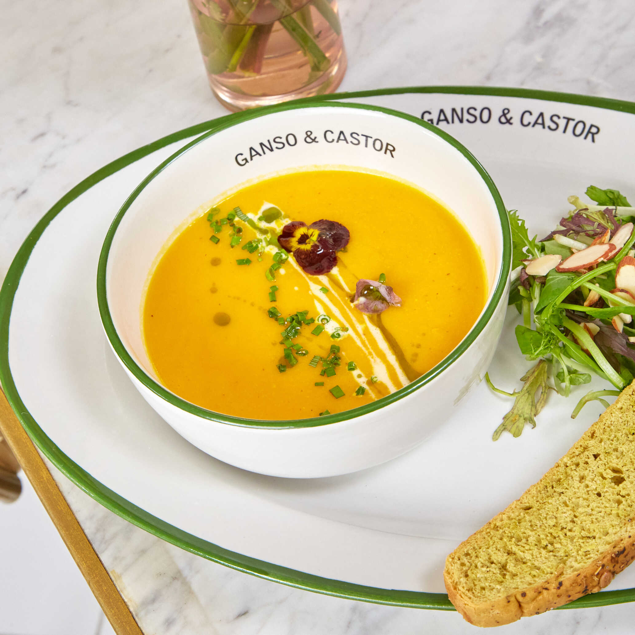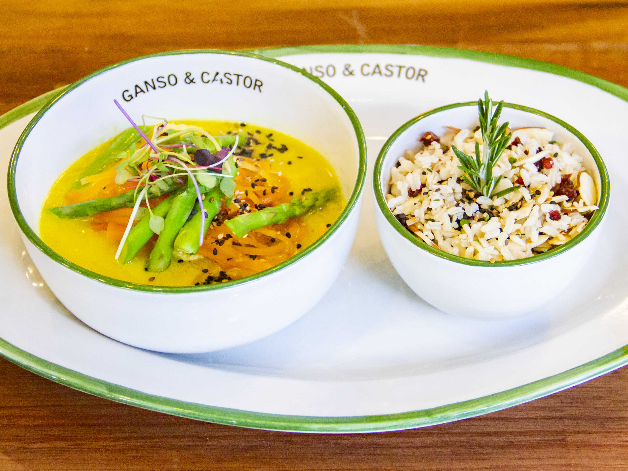 Estofado de res acompañado de pure cremoso, tomate perla y esparrago.