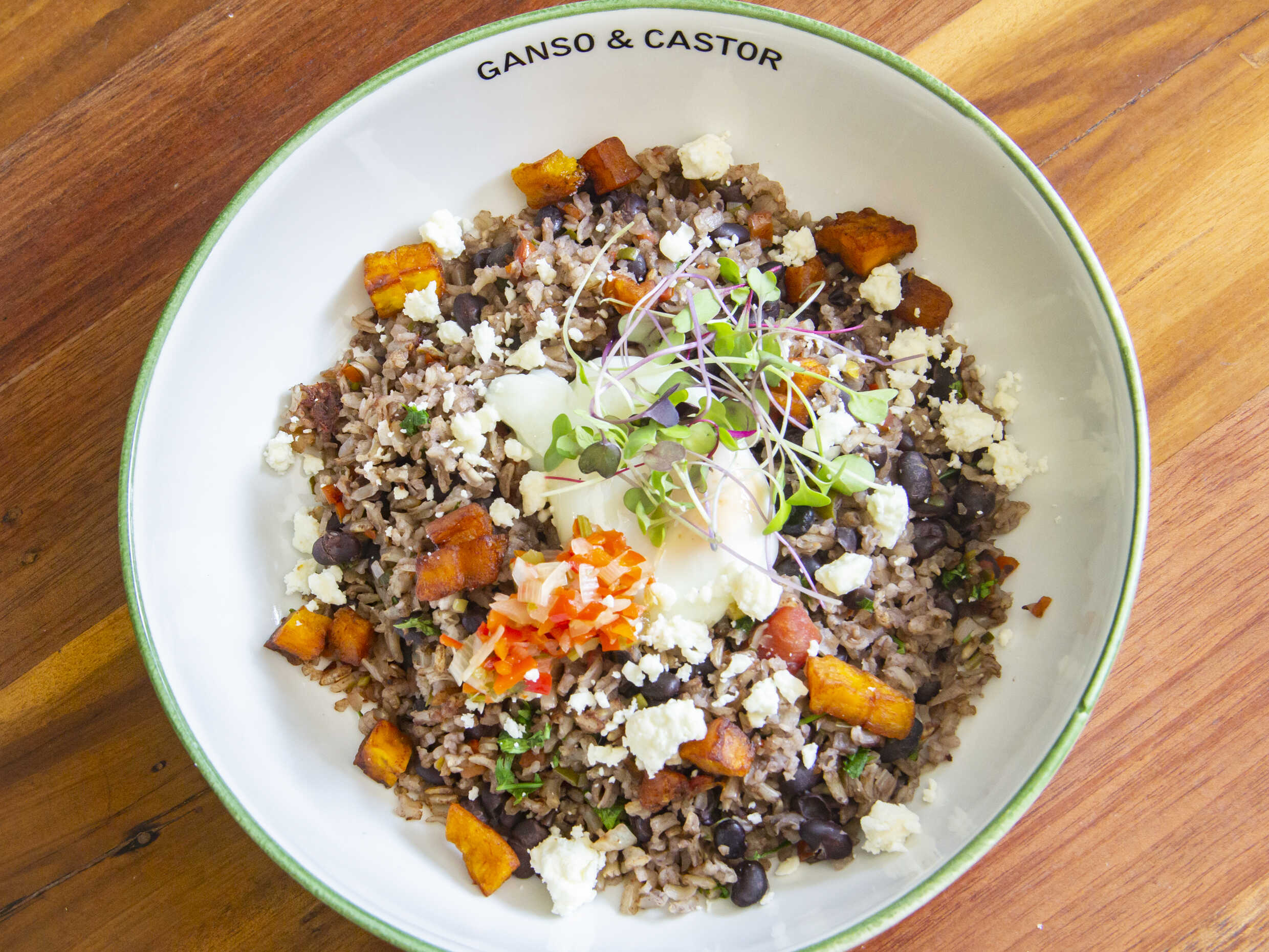 Calentado de frijol negro y arroz, acompañado de huevo poche, maduro y queso feta.