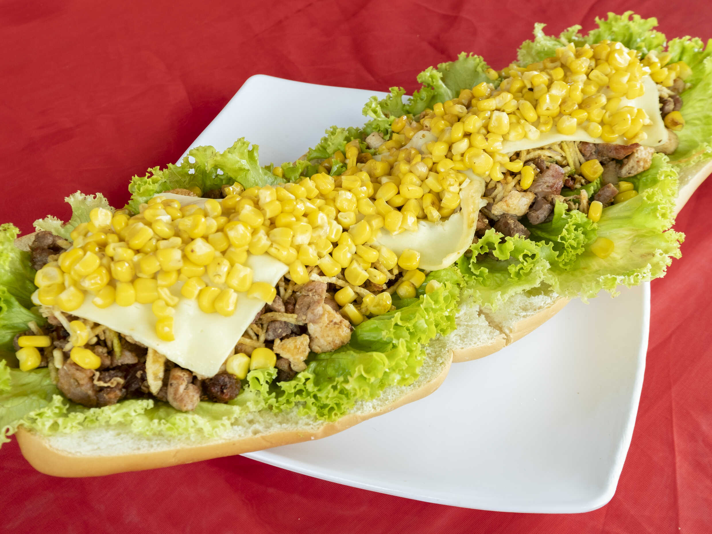 Pan artesanal, carne res y cerdo, ripio, lechuga, tomate, maíz, queso, tocineta más salsa rosada de la casa.