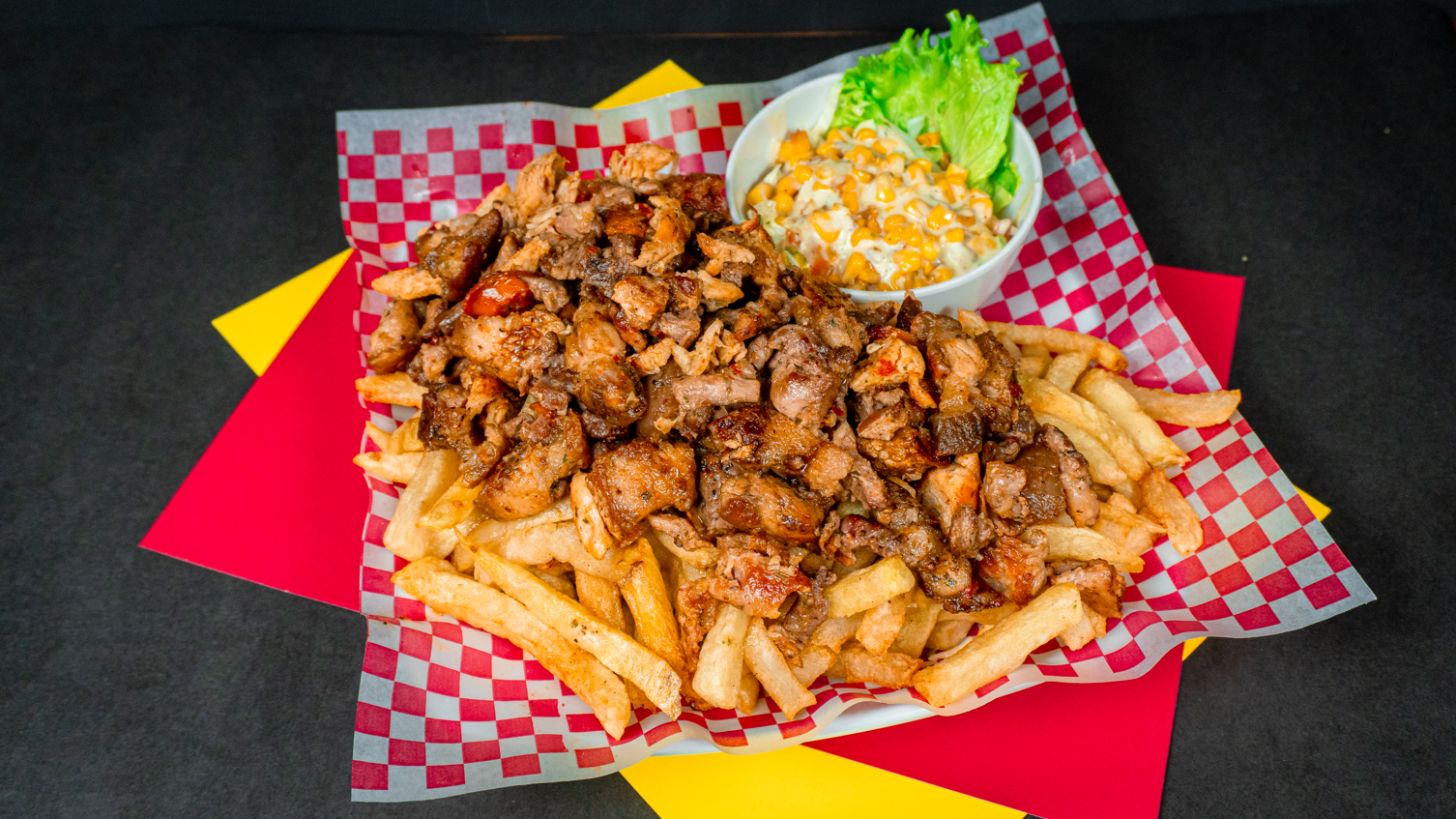 Carne, vegetales frescos, ripió de papa, queso mozzarella, tocineta y papas a la francesa.