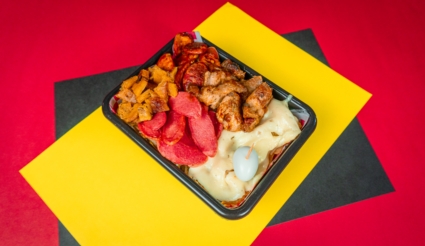 240 g De papas a la francesa, queso mozzarella, chicharrón, chorizo, madurito, salchicha ranchera, guacamole, huevo de codorniz y salsa de la casa.