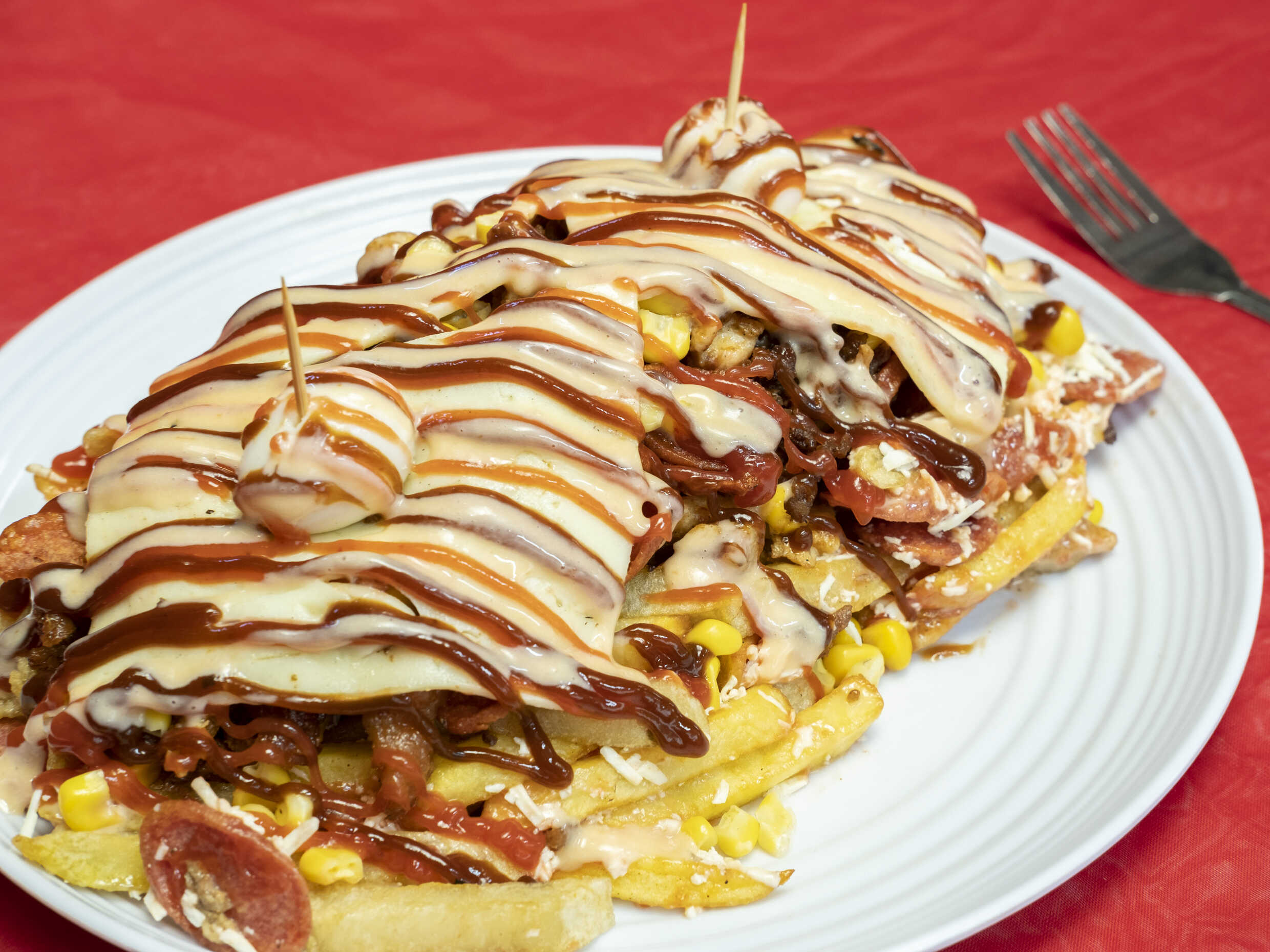 Papas a la francesa, huevo de codorniz, queso mozzarella, cerdo desmechado en salsa BBQ, (guacamole o queso crema según disponibilidad) y salsa rosada de la casa.