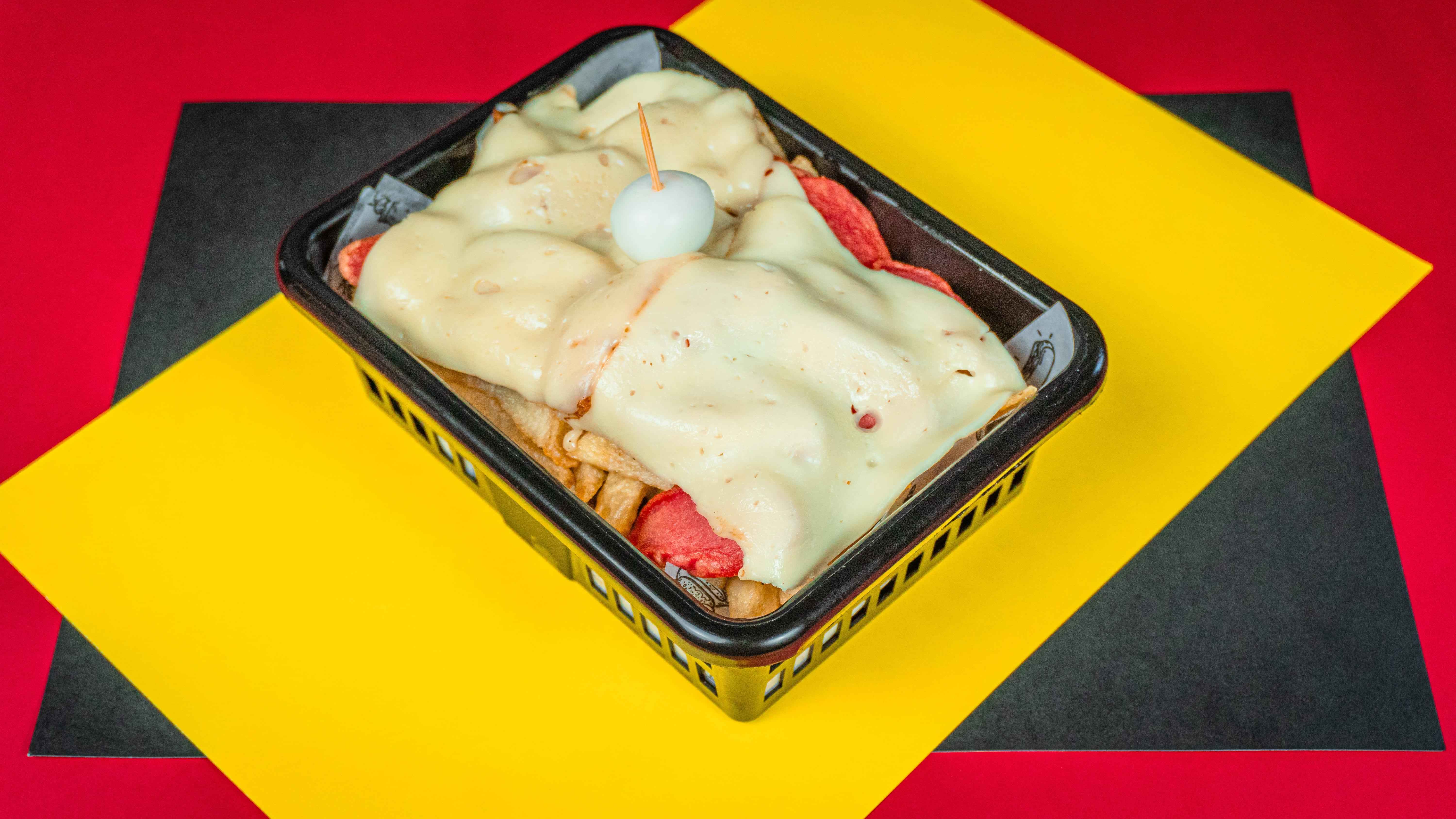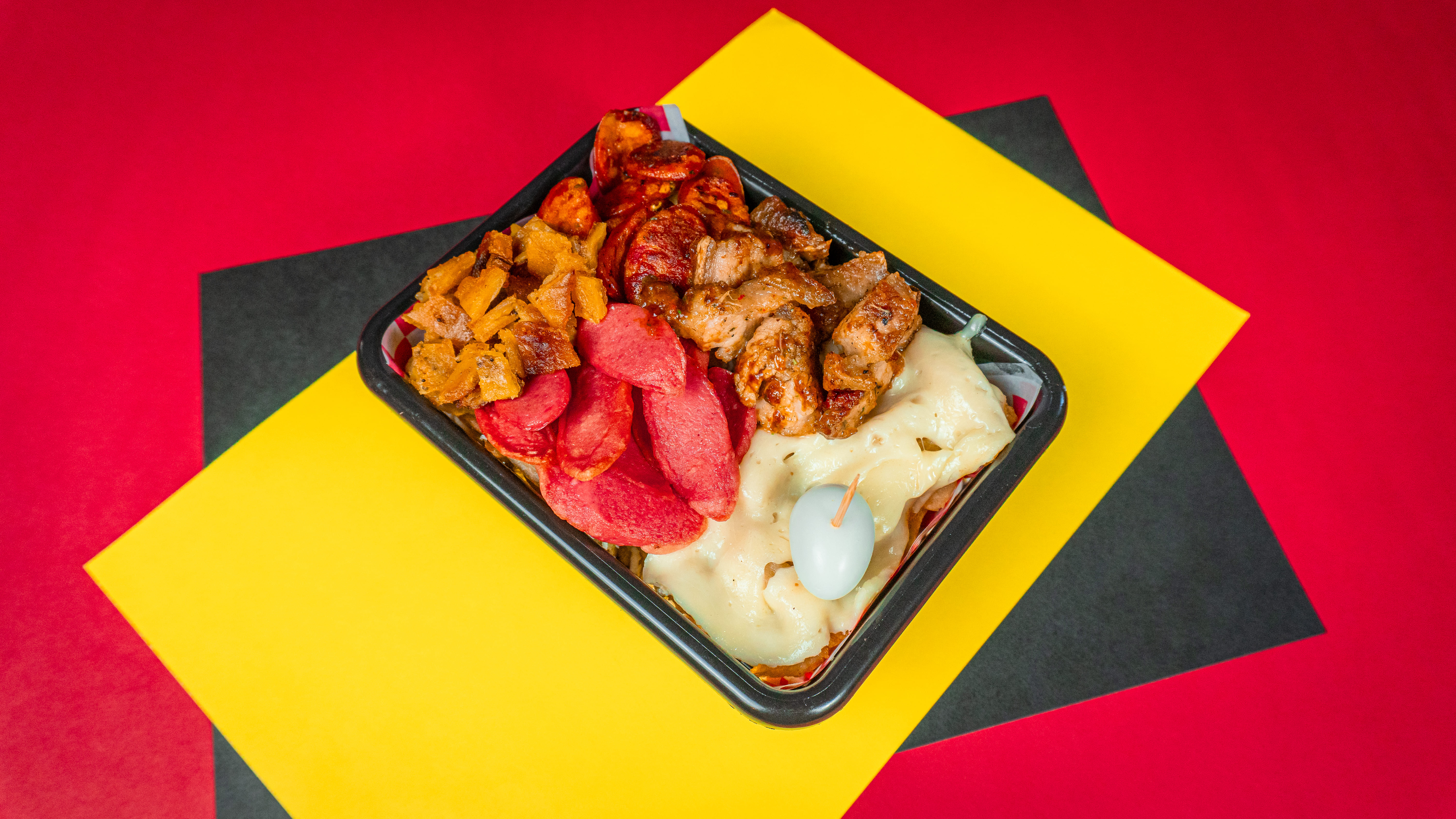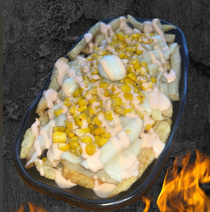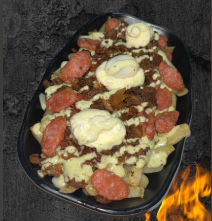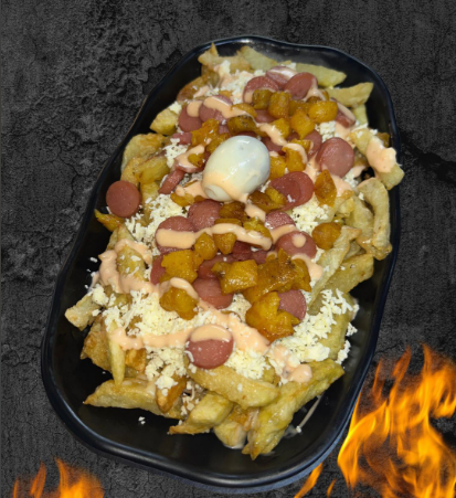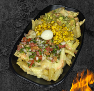 240 g de papas a la francesa doradas y crujientes, cubiertas con queso mozzarella fundido, trozos de chicharrón crocante, sabroso chorizo, madurito caramelizado, salchicha ranchera, cremoso guacamole, huevo de codorniz y el toque final de salsas a elección. Un viaje de sabor con puro flow criollo.