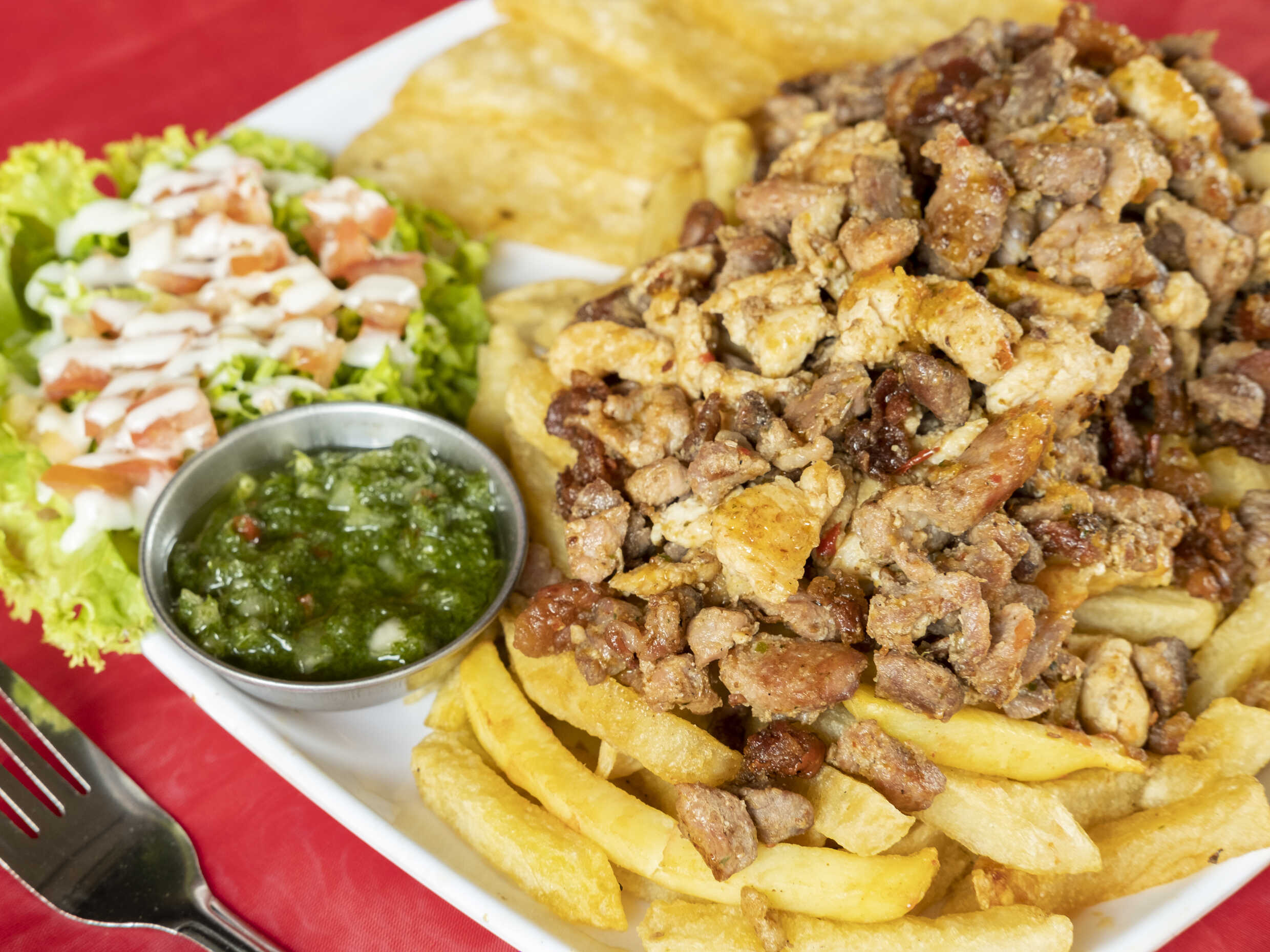 Una explosiva mezcla de sabores: papas a la francesa acompañadas de carne de res, cerdo, pollo, chicharrón y chorizo, todo en una porción pensada para ti. Servida con patacón crujiente, guacamole de la casa y ensalada fresca. ¡El sabor en cada bocado!