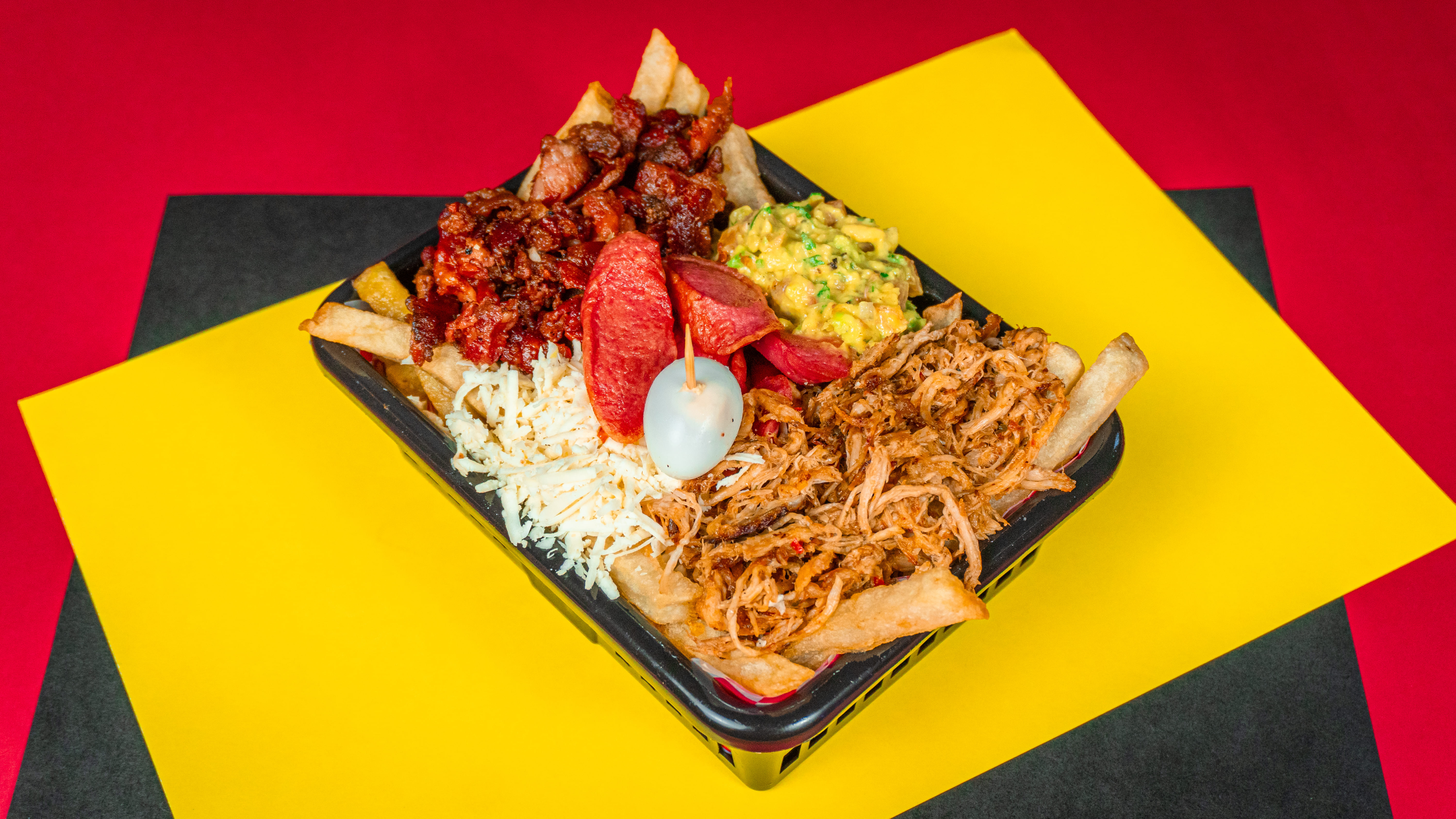 240 g de papas a la francesa crocantes, cargadas con queso rallado, salchicha tradicional, cremoso guacamole, jugoso pulled pork, tocineta dorada, huevos de codorniz y un toque final de salsas a elección. Todo lo que te gusta, en una sola explosión de sabor.