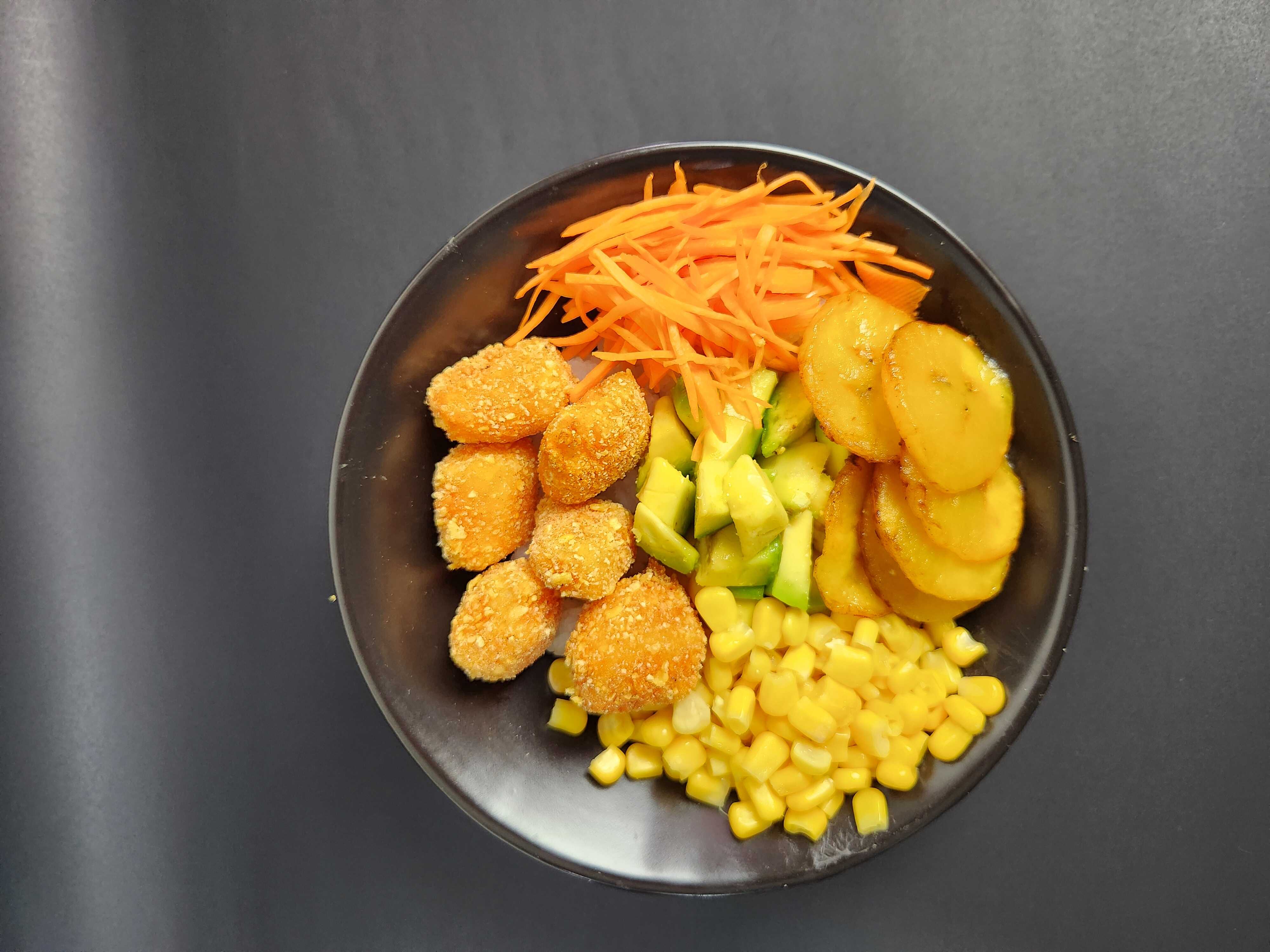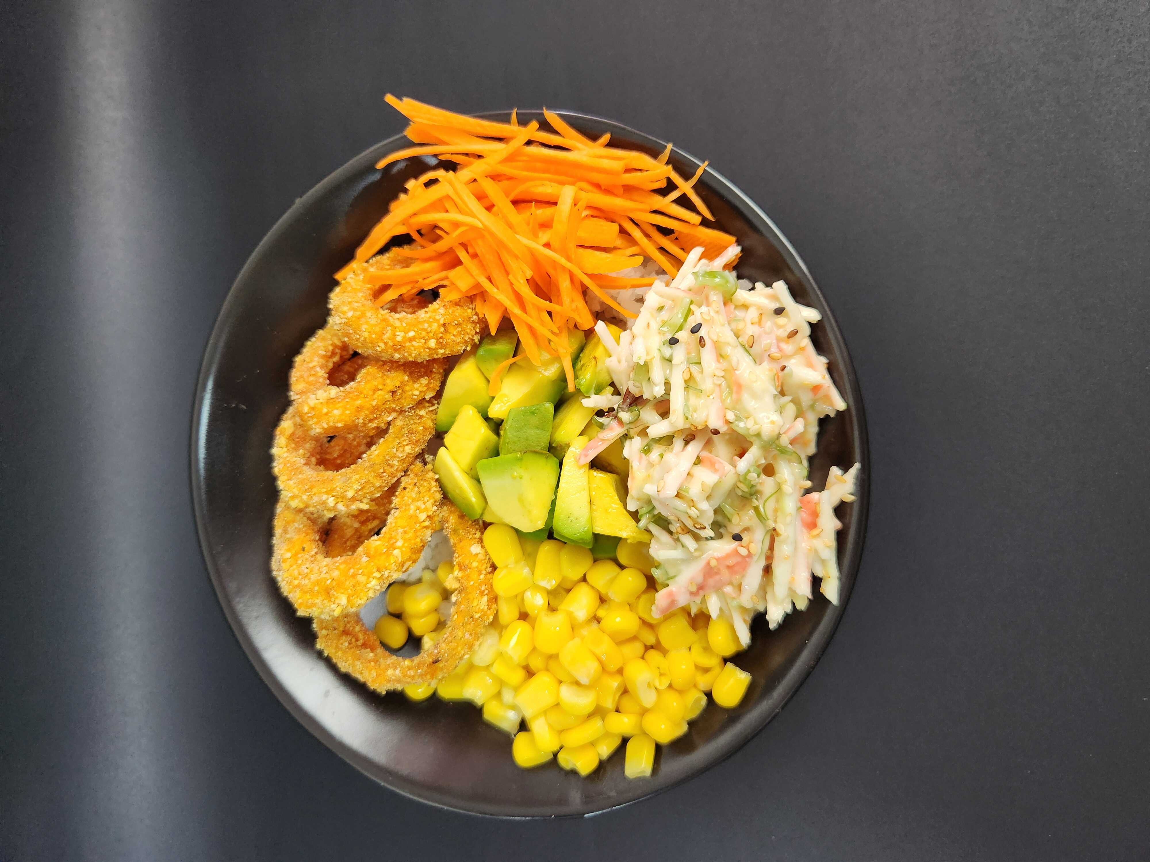 Arroz de Sushi, Palmito de Cangrejo, maíz, cebolla crispy, aguacate, zanahoria y salsa Soya/Teriyaki